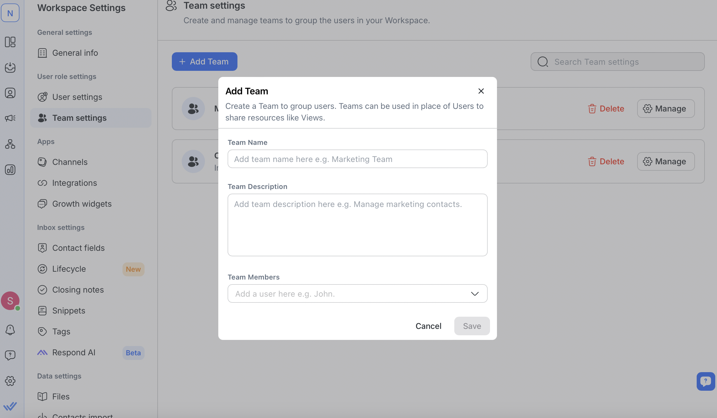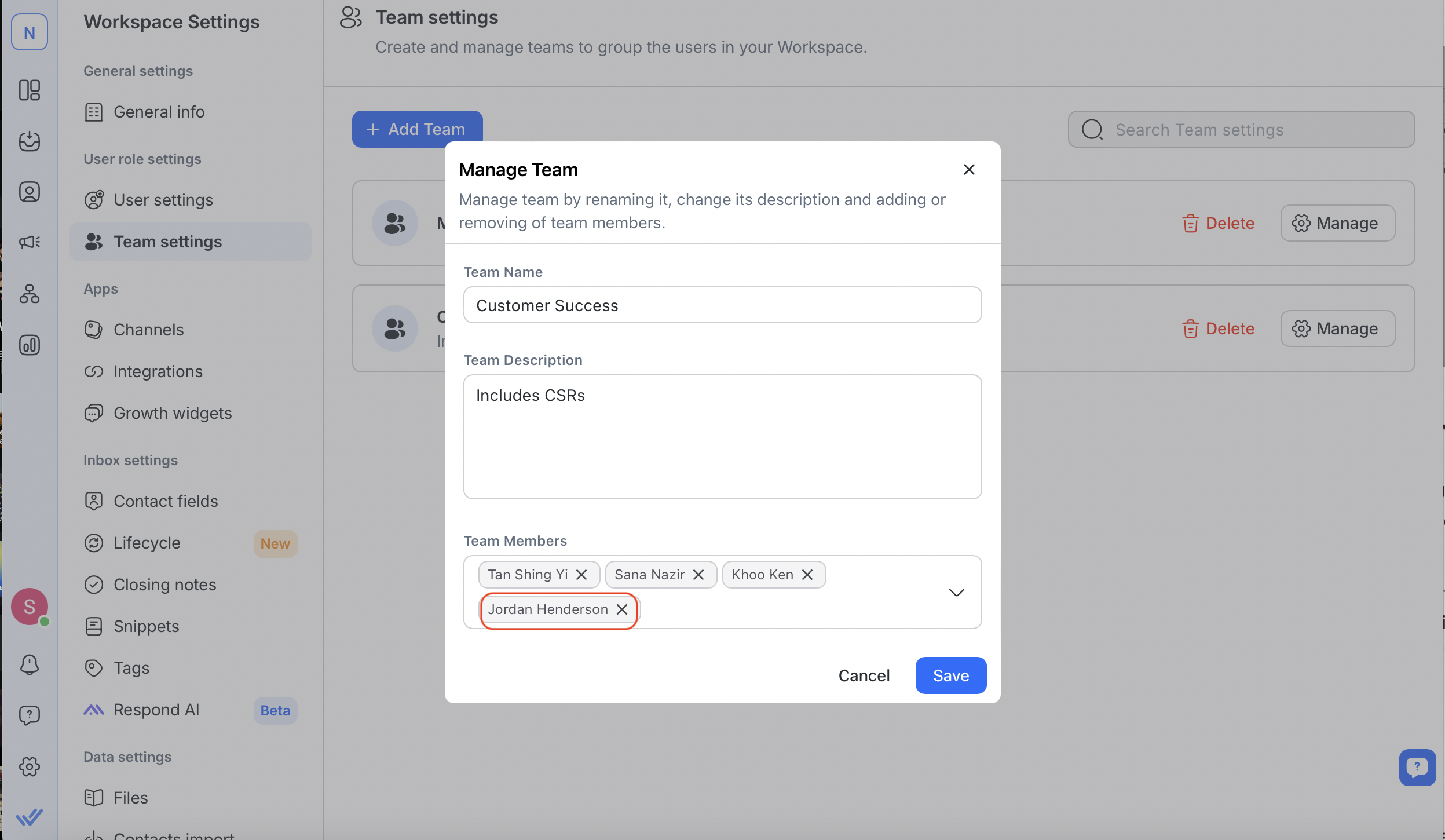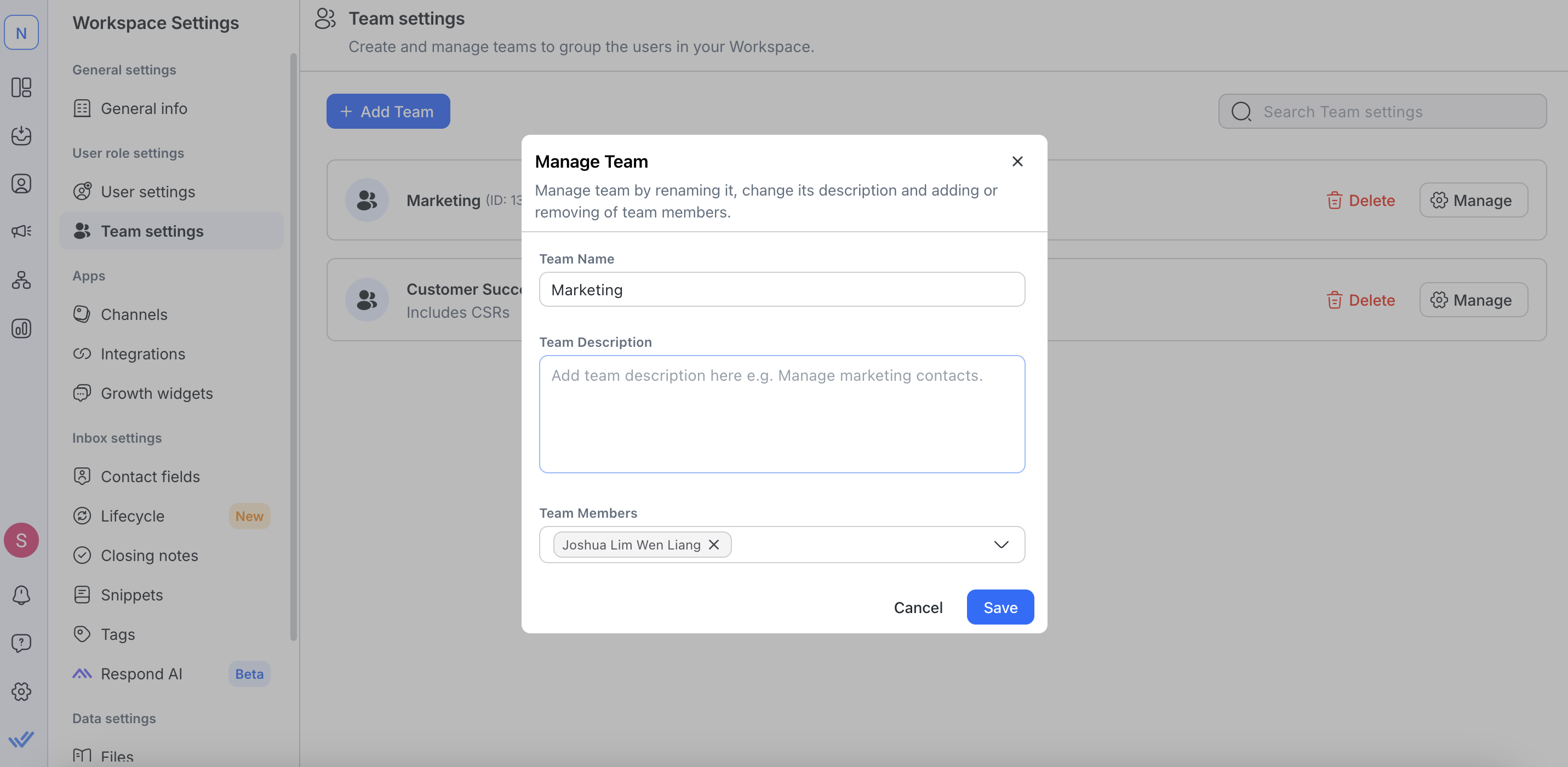 Note: Each User can belong to only one Team. To move a User, remove them from their current Team before adding them to another.