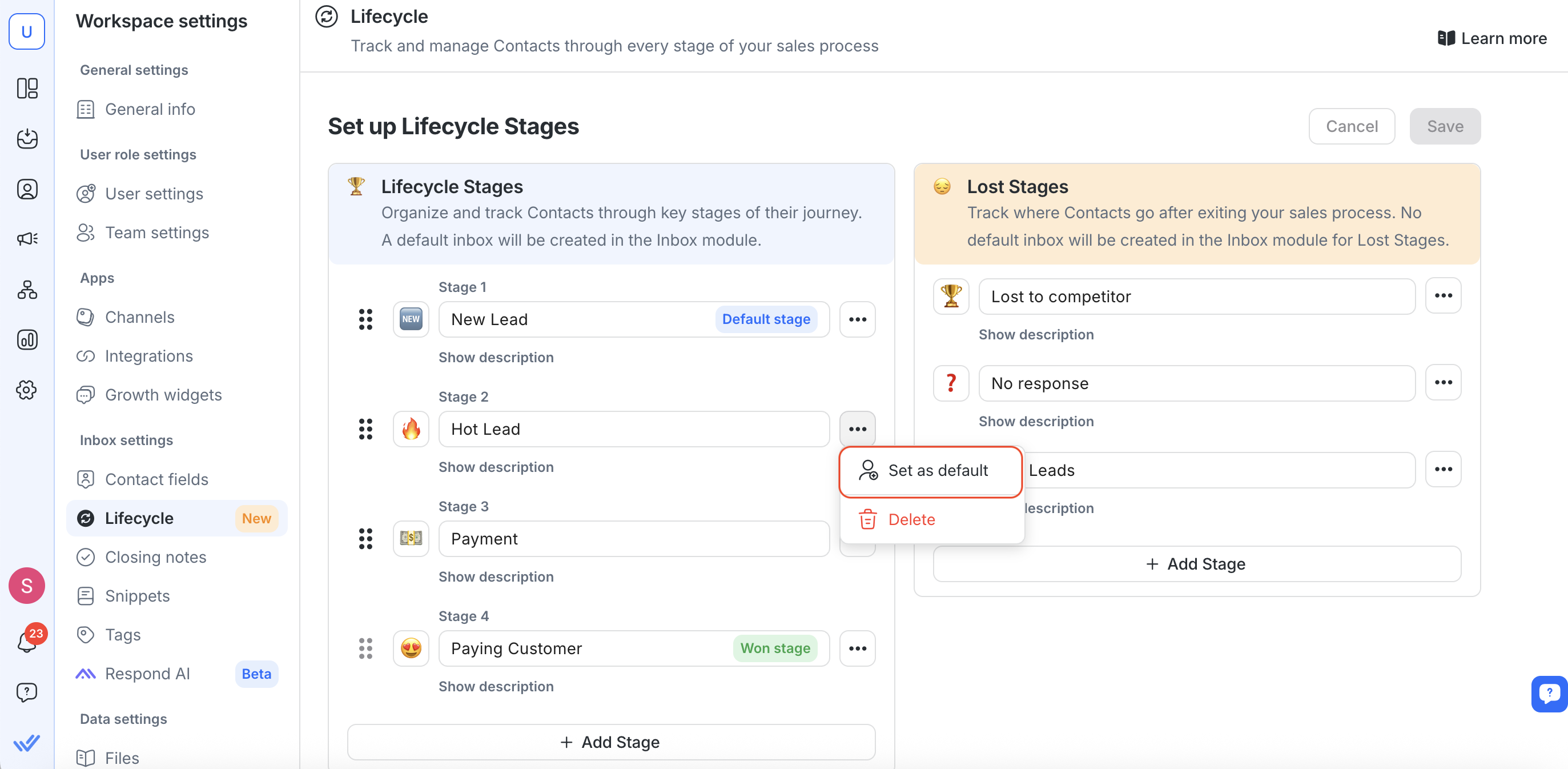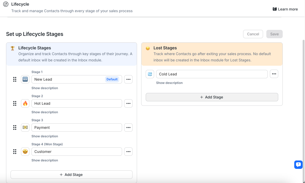 Lost Stages are not assigned to default inboxes but help you track drop-offs within your sales funnel.