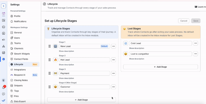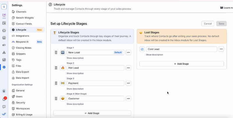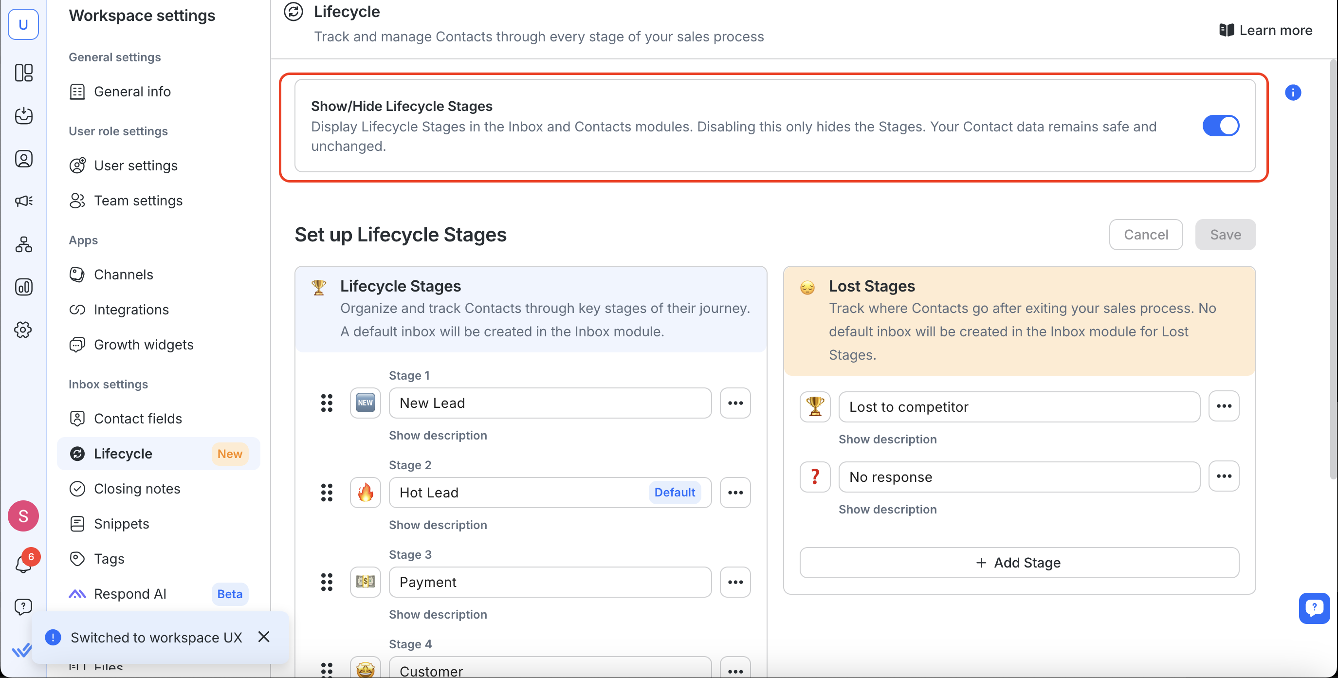 You can also enable Lifecycle manually by turning on the “Show Lifecycle Stages” toggle in the platform’s settings. This will make Lifecycle visible in the Inbox and Contacts modules.