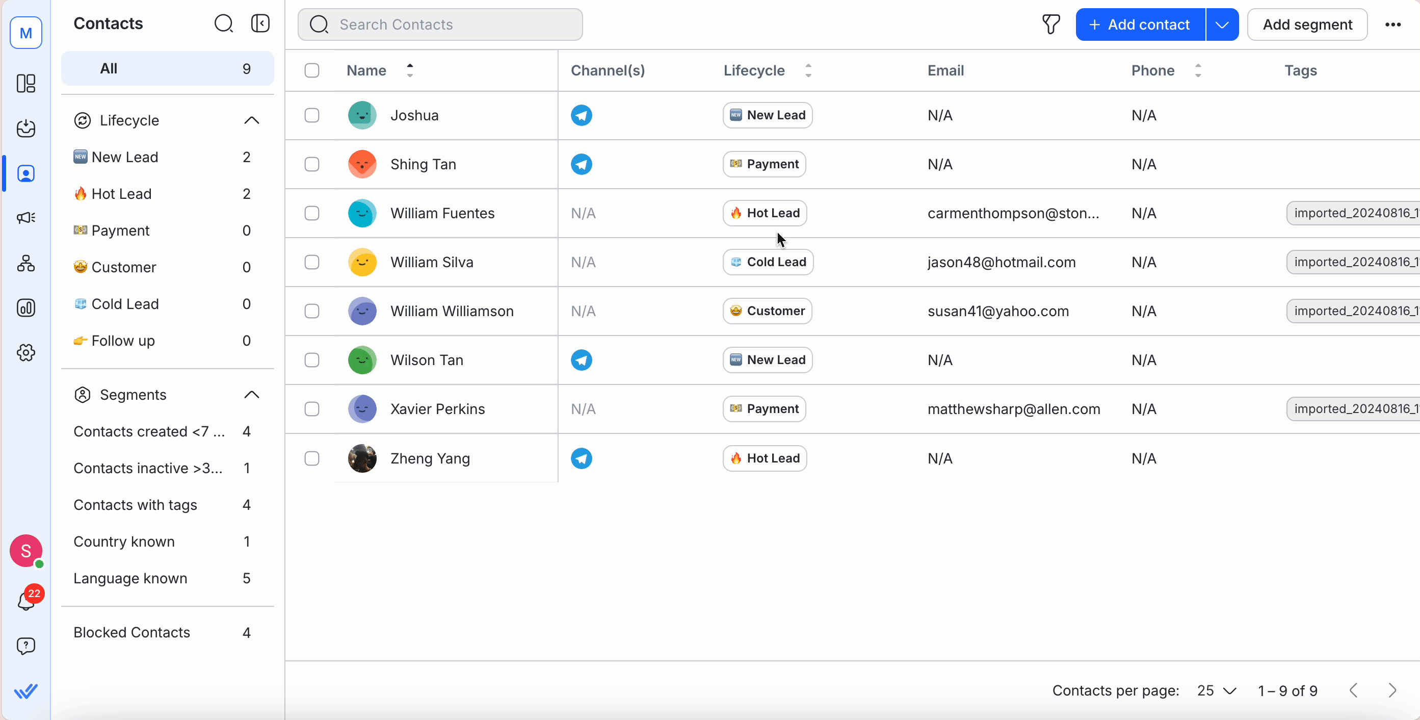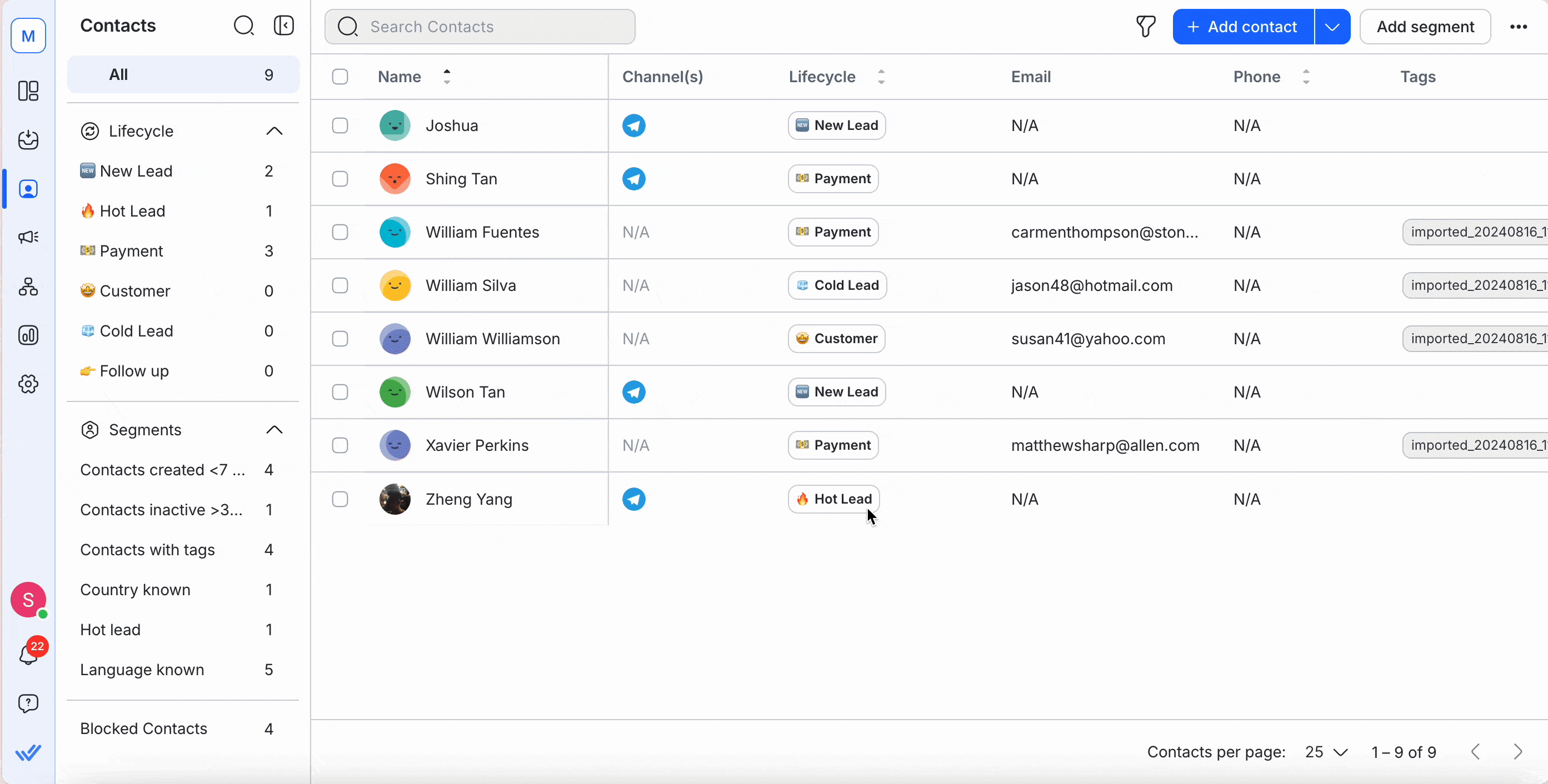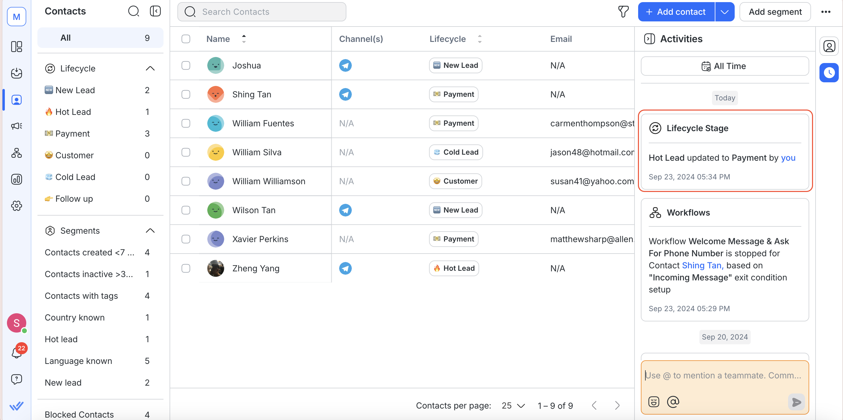 You can also create Lifecycle segments to view and filter Contacts. Segments allow you to group and manage Contacts based on their stage, offering a convenient way to stay on top of your sales pipeline.