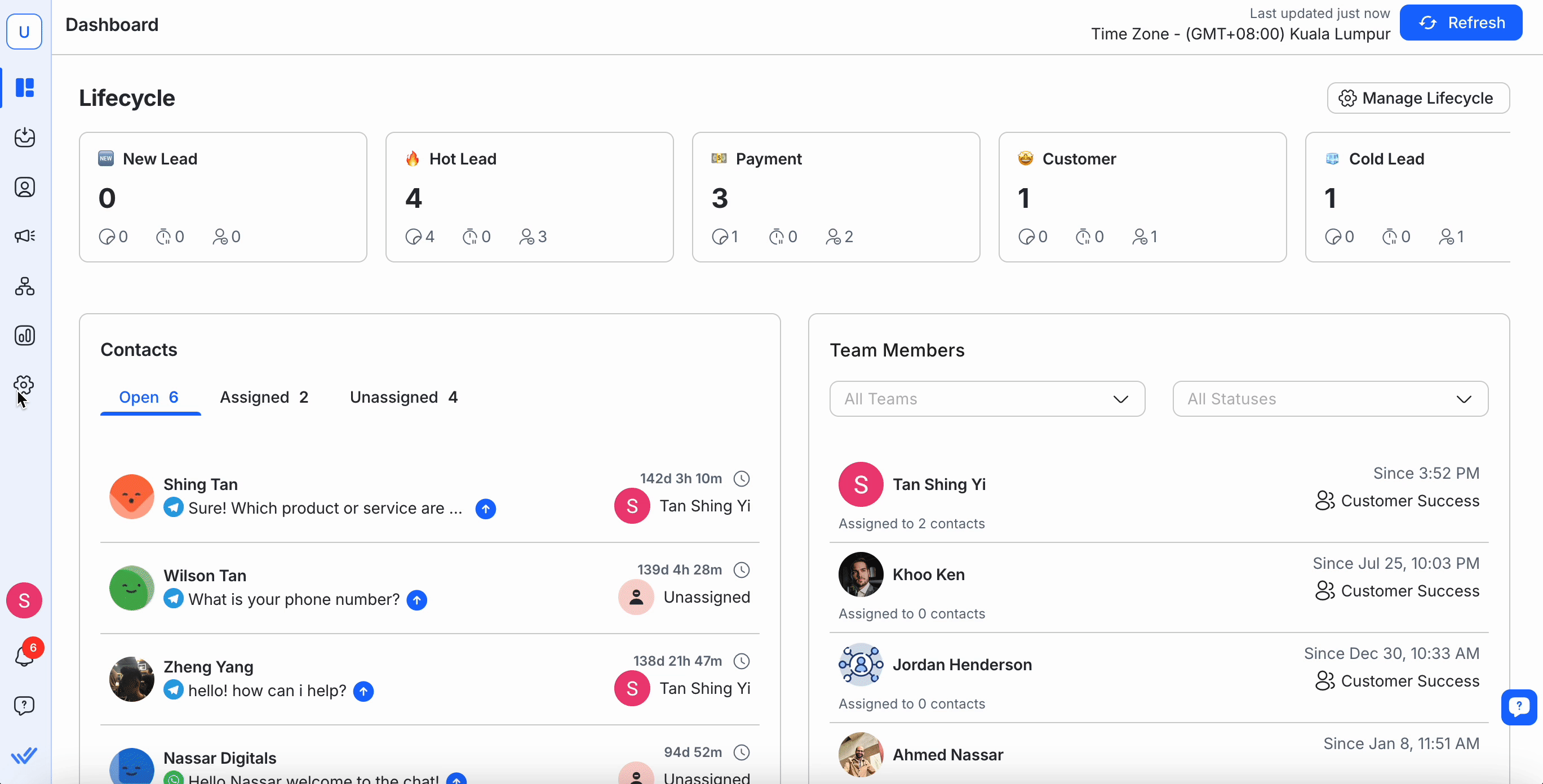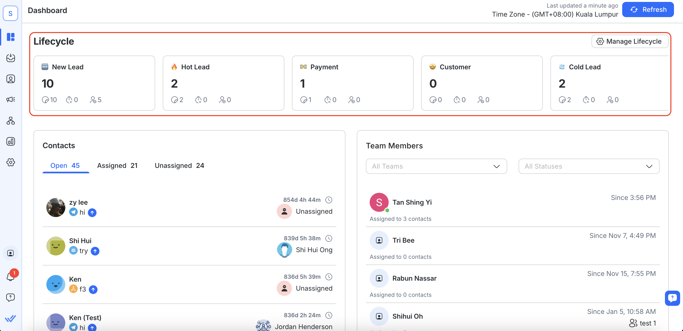 With Lifecycle metrics in the Dashboard, owners and managers can now view the distribution of Contacts across Lifecycle Stages at a glance. This includes real-time counts for each stage (excluding Lost Stages), such as the number of open, snoozed, or unassigned conversations for a given stage.