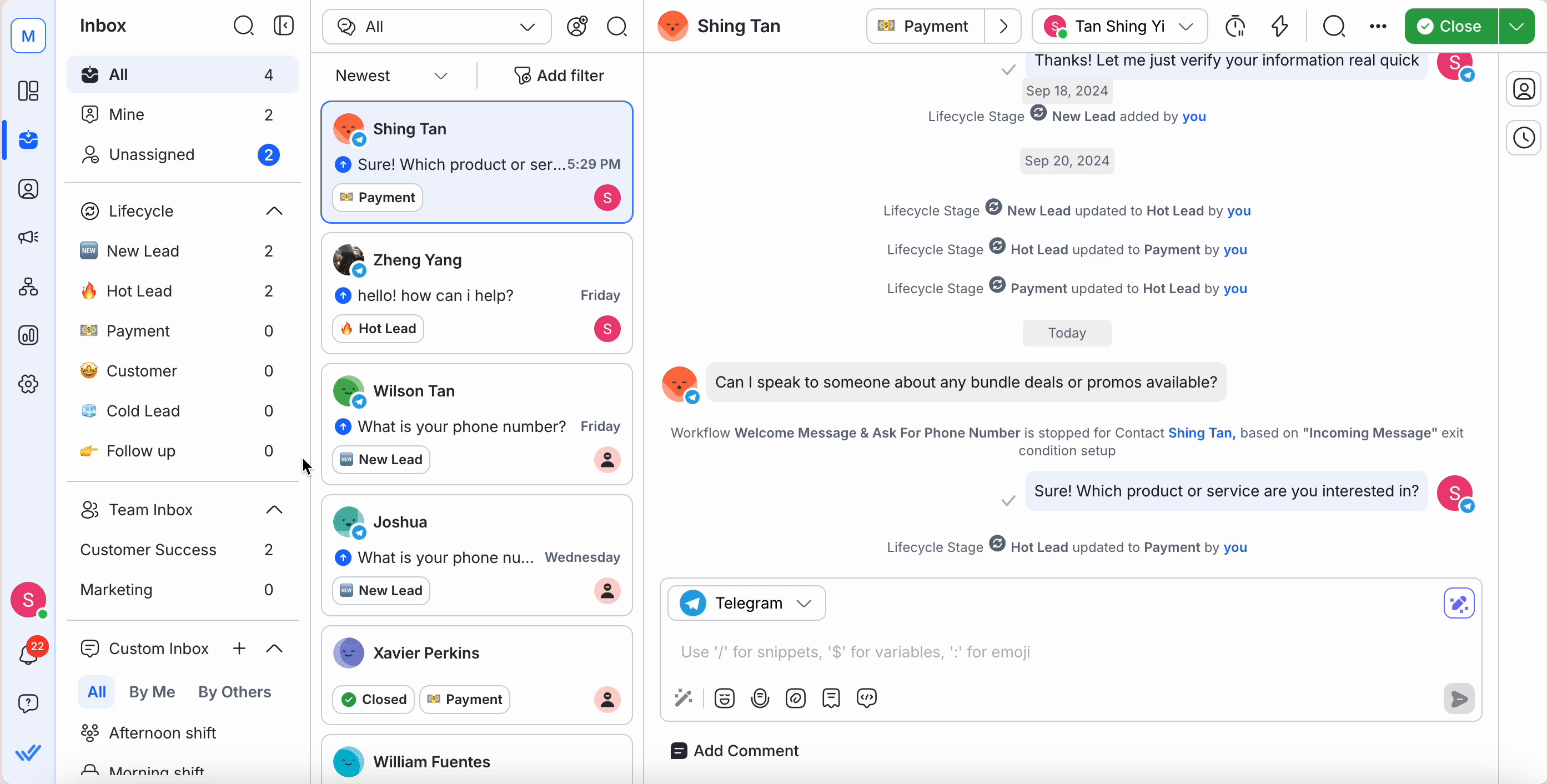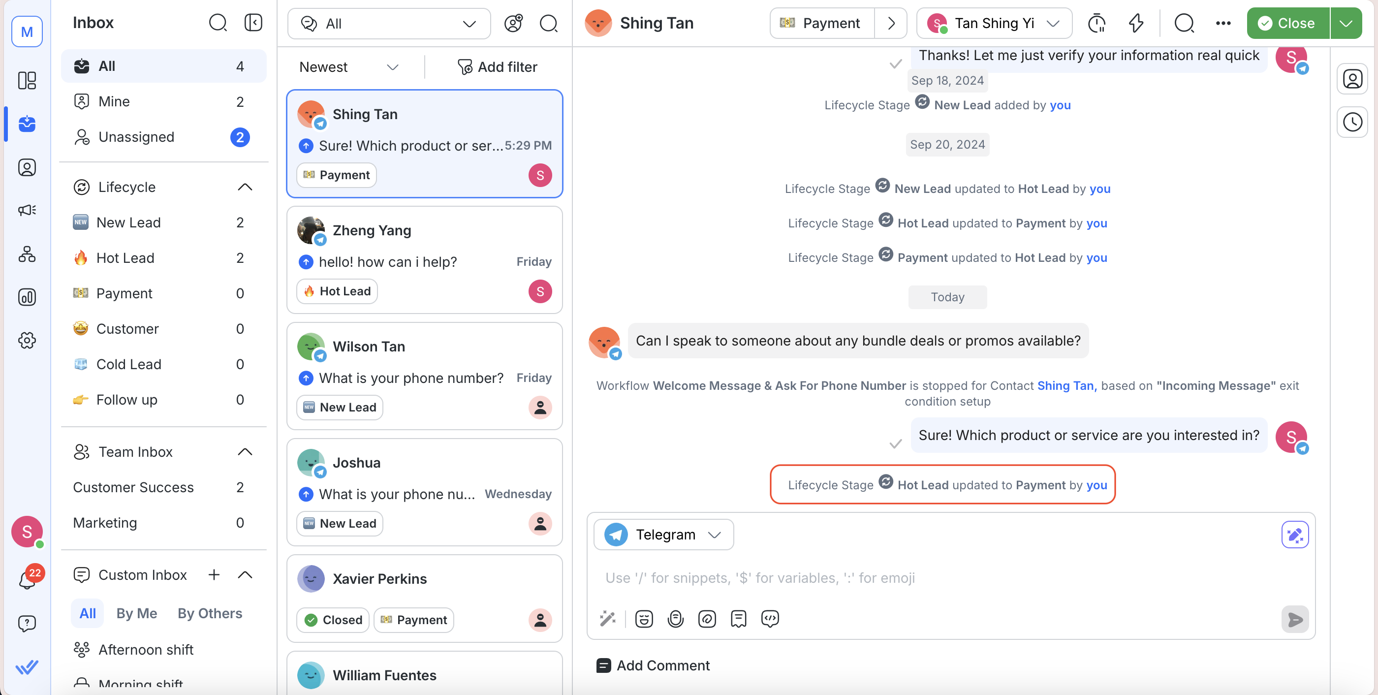 In the Inbox module, you can quickly assign and update stages for your Contacts. This includes both Lifecycle Stages and Lost Stages, allowing you to track progression in your sales process. For example, if a lead becomes unresponsive, you can move them to a Lost Stage such as Cold Lead.