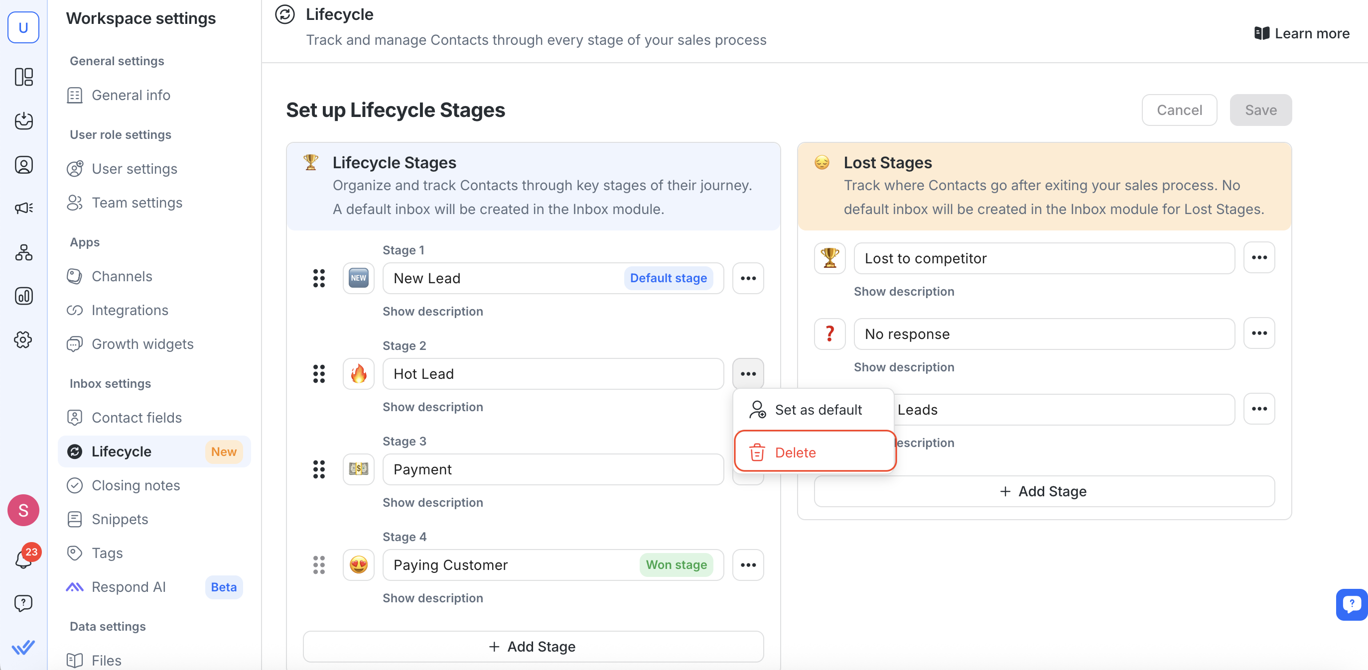 Lost Stages are designed to track Contacts who leave the sales process, offering insights into drop-off points. Lifecycle comes with one Lost Stage, which you can edit or remove like all other Stages: