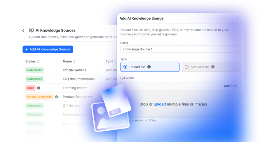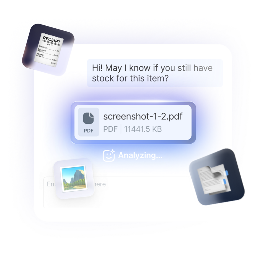 Ya. Agen AI dapat memproses gambar dan jenis file umum seperti PDF. Ia dapat mengidentifikasi produk dari foto, membaca nomor pesanan dari faktur, atau menginterpretasikan pesan kesalahan dari tangkapan layar. Anda juga dapat menguji bagaimana ia menangani file-file ini selama pengaturan dengan mengunggah PDF, gambar, atau dokumen untuk memvalidasi perilaku sebelum pergi langsung.