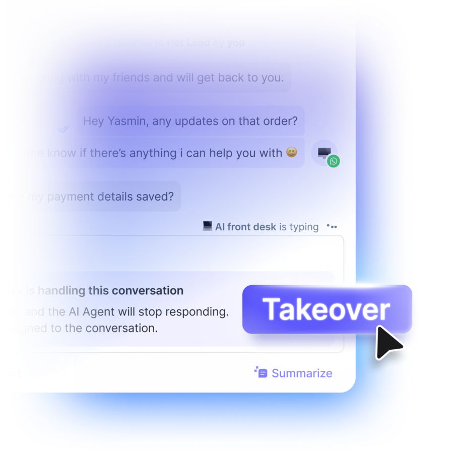 Kampanye mendorong permintaan, tetapi Anda membuang waktu untuk mengkualifikasi prospek dengan niat rendah. Agen Penjualan AI Anda menjawab pertanyaan, merekomendasikan produk, mengkualifikasi pelanggan, mengirim tautan pembayaran atau pemesanan, dan hanya mengarahkan pembeli yang siap ke tim Anda untuk konversi yang lebih cepat.