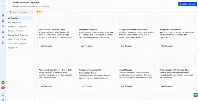 Strong Facebook chatbots are powered by automation, not manual handling. Look for platforms with visual workflow builders that let you route chats, trigger follow-ups, update lifecycle stages, launch campaigns or sync data automatically—without writing code.