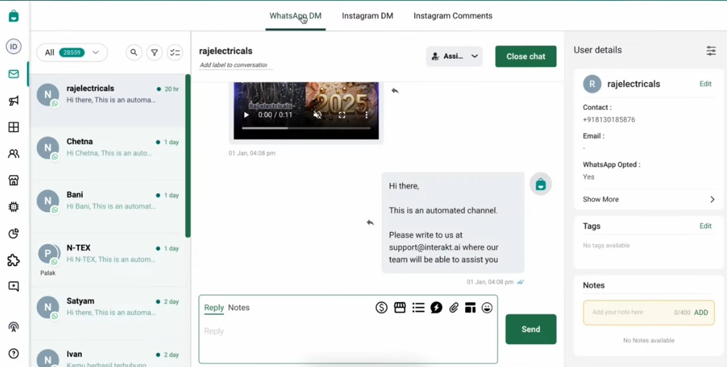 Interakt is a WhatsApp-first business CRM built for small businesses with emphasis on Instagram and AI Agents. It also offers simple automation, broadcasts and basic CRM features, while its shared inbox supports collaboration across teams.