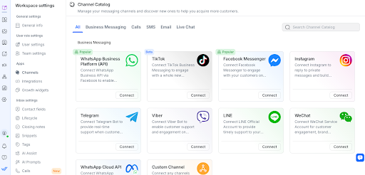 Supports all major channels and custom channels, including WhatsApp, TikTok, Facebook Messenger, Instagram, voice and web chat.
