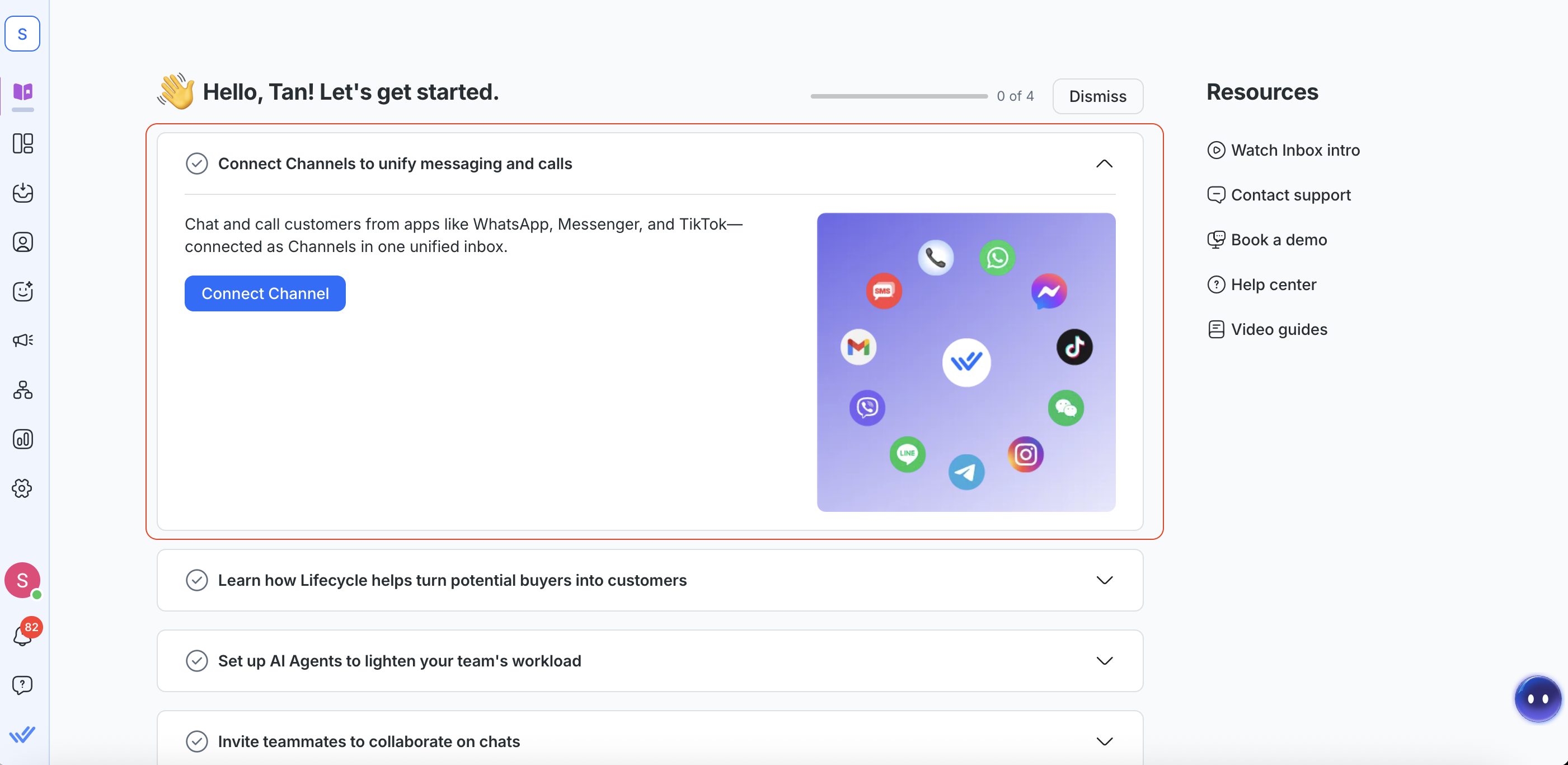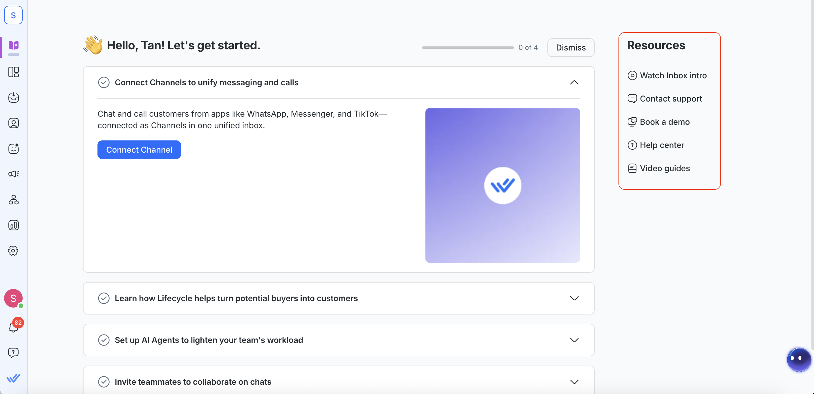 • Connect a Channel so customer conversations can start flowing into your Inbox