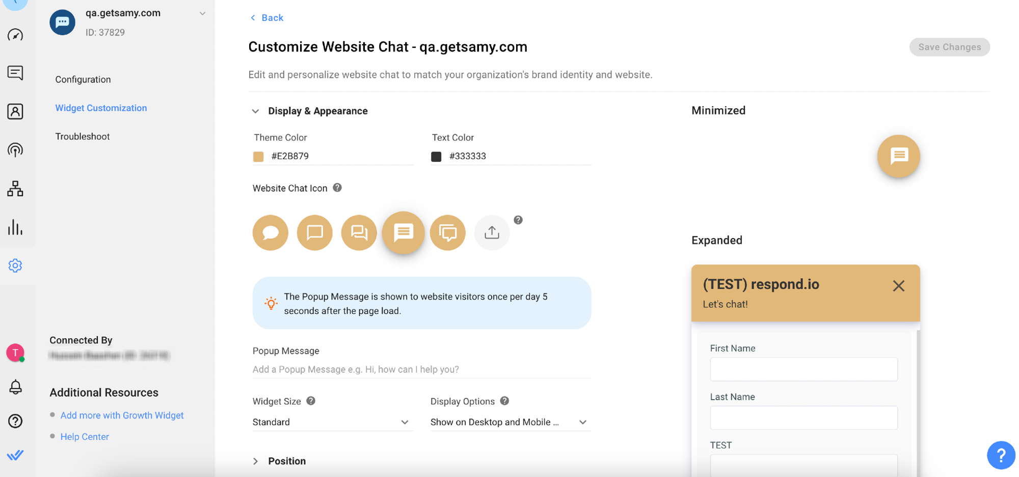 Widget Obrolan Situs Web respond.io akan muncul di situs Anda setelah skrip berhasil dipasang.