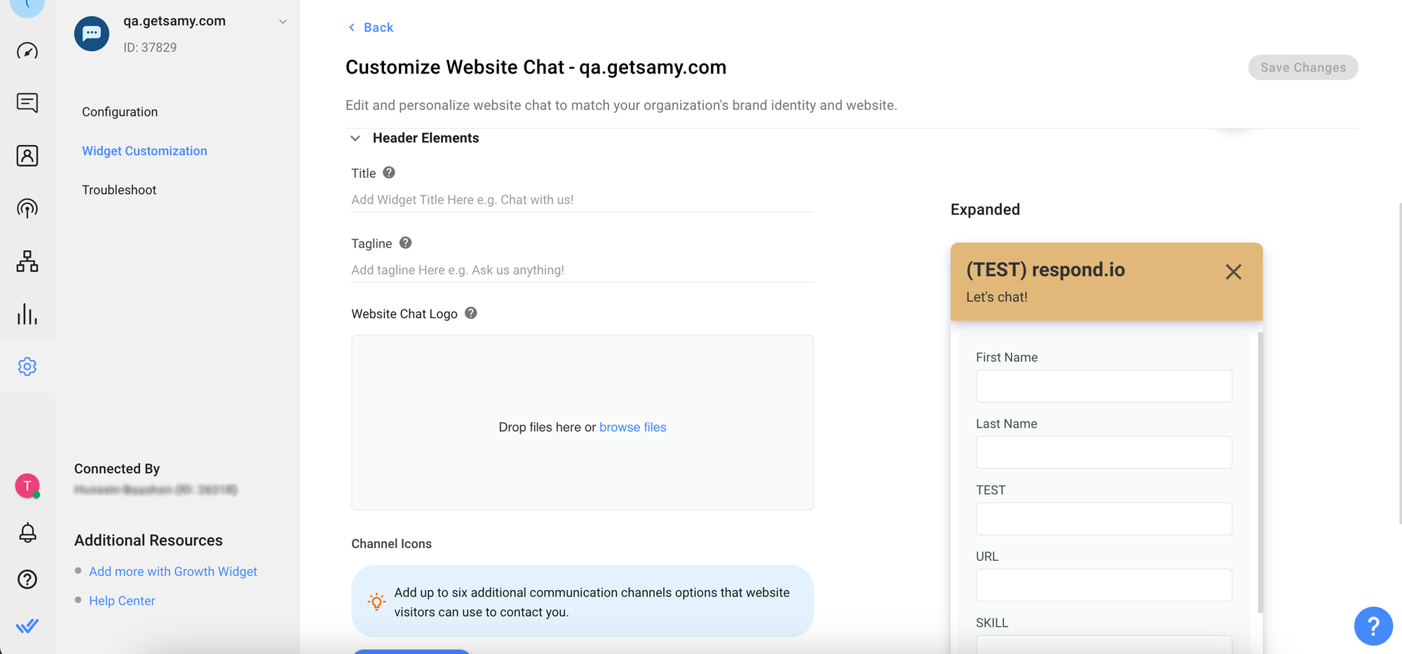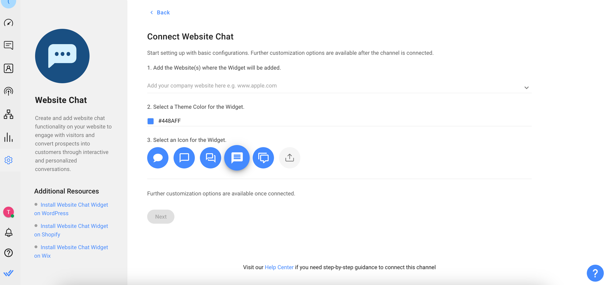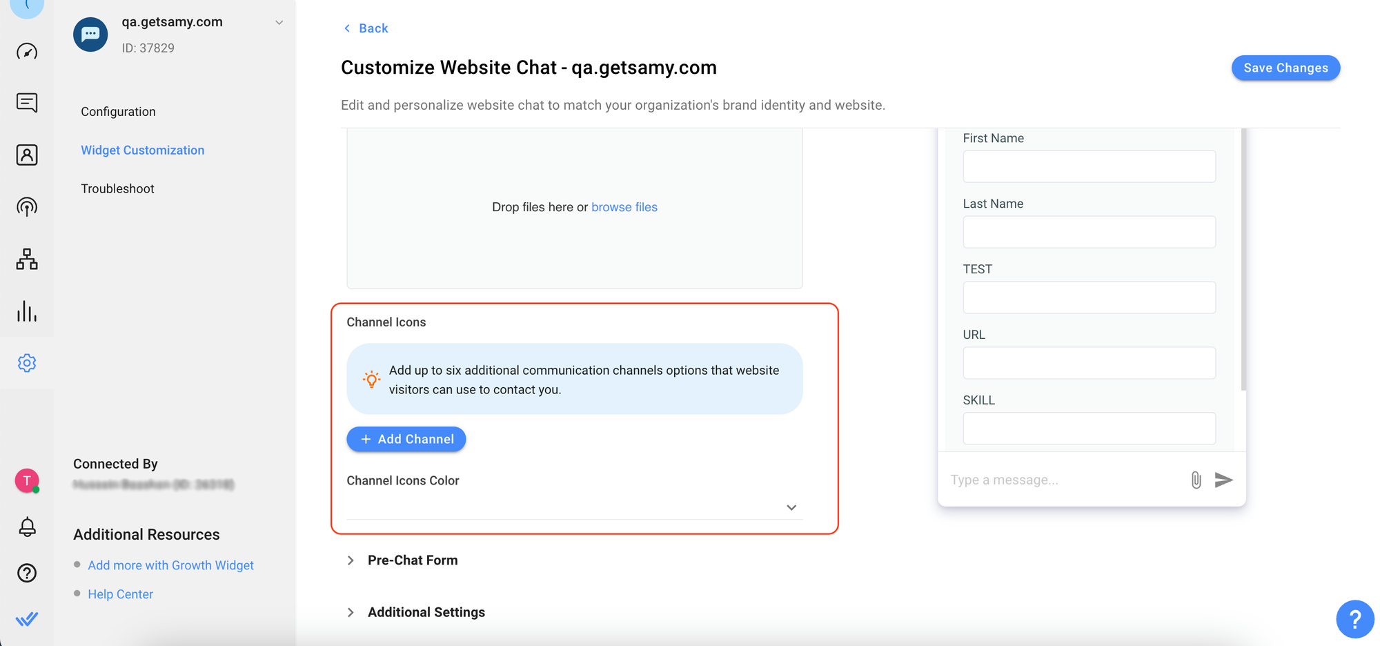 Ikon Saluran | Pilihan ini akan memungkinkan Kontak untuk menghubungi Anda melalui Saluran pilihan mereka asalkan pilihannya diberikan. Anda dapat menambahkan hingga enam Saluran dan itu akan ditampilkan di bagian atas Widget Obrolan Situs Web. |