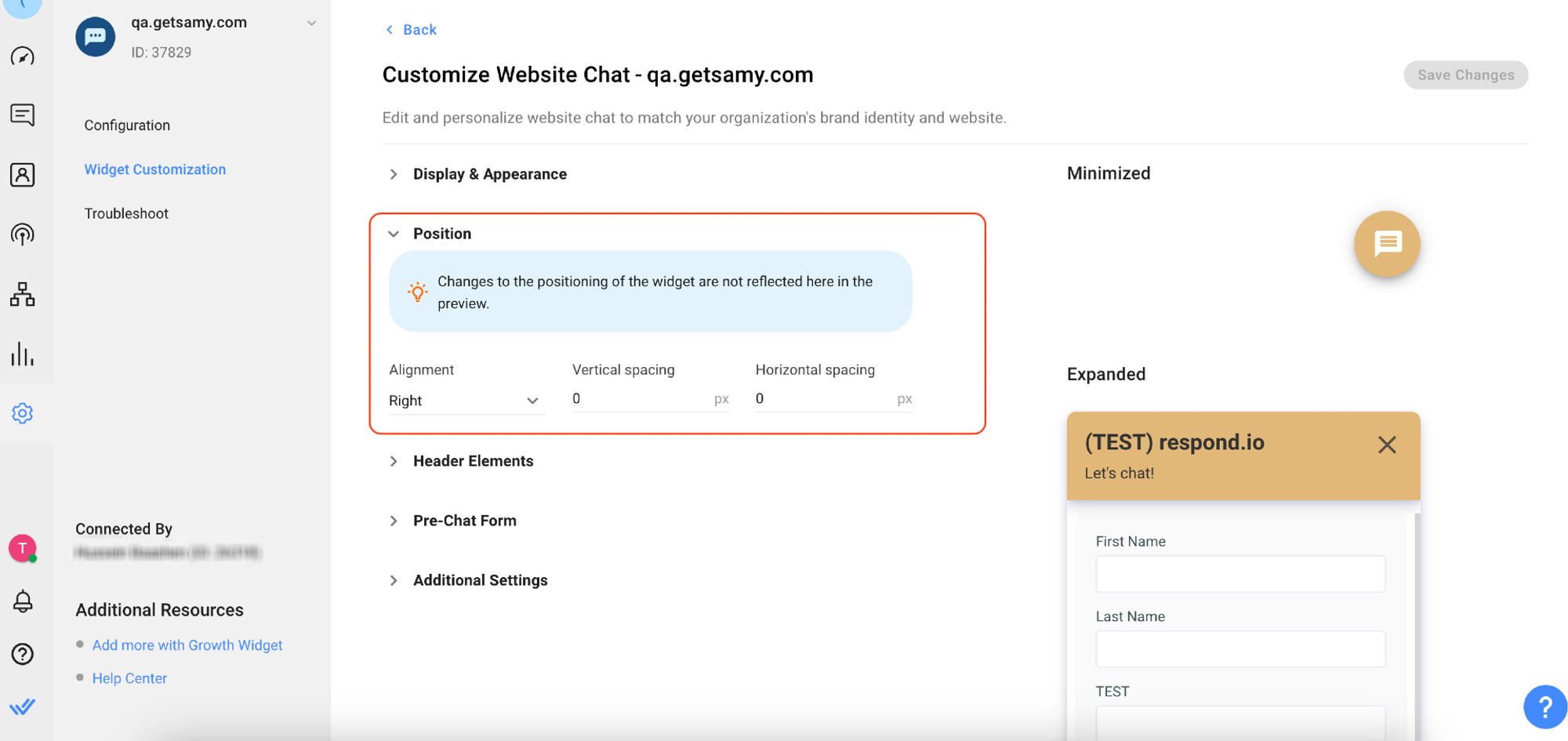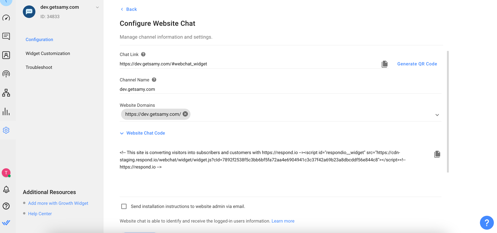 Pastikan untuk memasukkan situs web tempat widget akan dipasang ke daftar putih. Lihat Langkah 3 dari Menghubungkan Widget Obrolan Situs Web tentang cara memasukkan domain Anda ke dalam daftar putih.