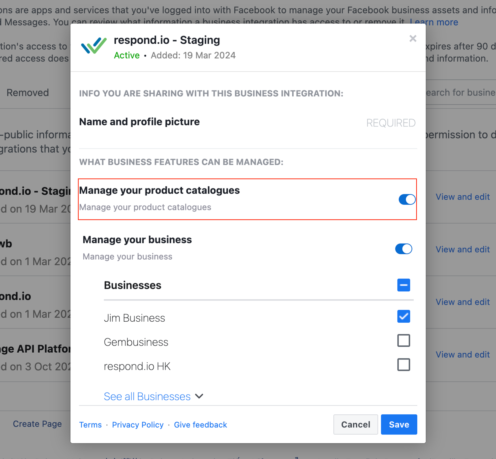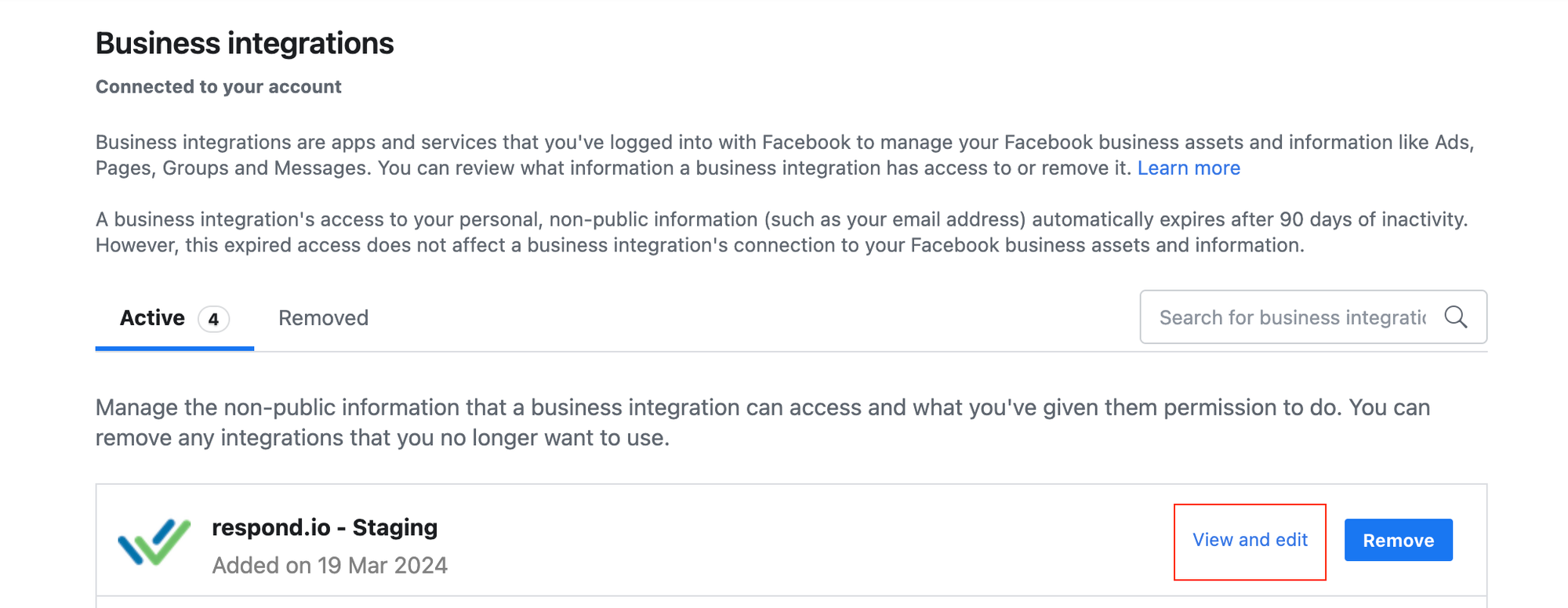 2. Pilih aplikasi terintegrasi respond.io dan klik Lihat dan edit