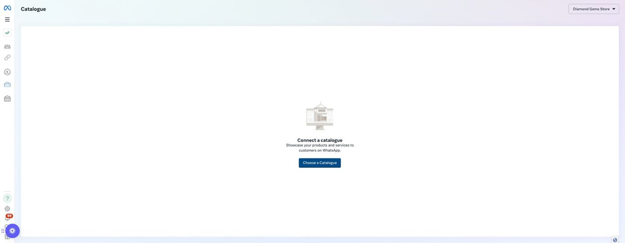 Sebelum Anda dapat mulai menggunakan Meta Product Catalog, Anda harus terlebih dahulu menghubungkan katalog ke Akun WhatsApp Business (WABA) Anda di Meta Business Manager (MBM) Anda.