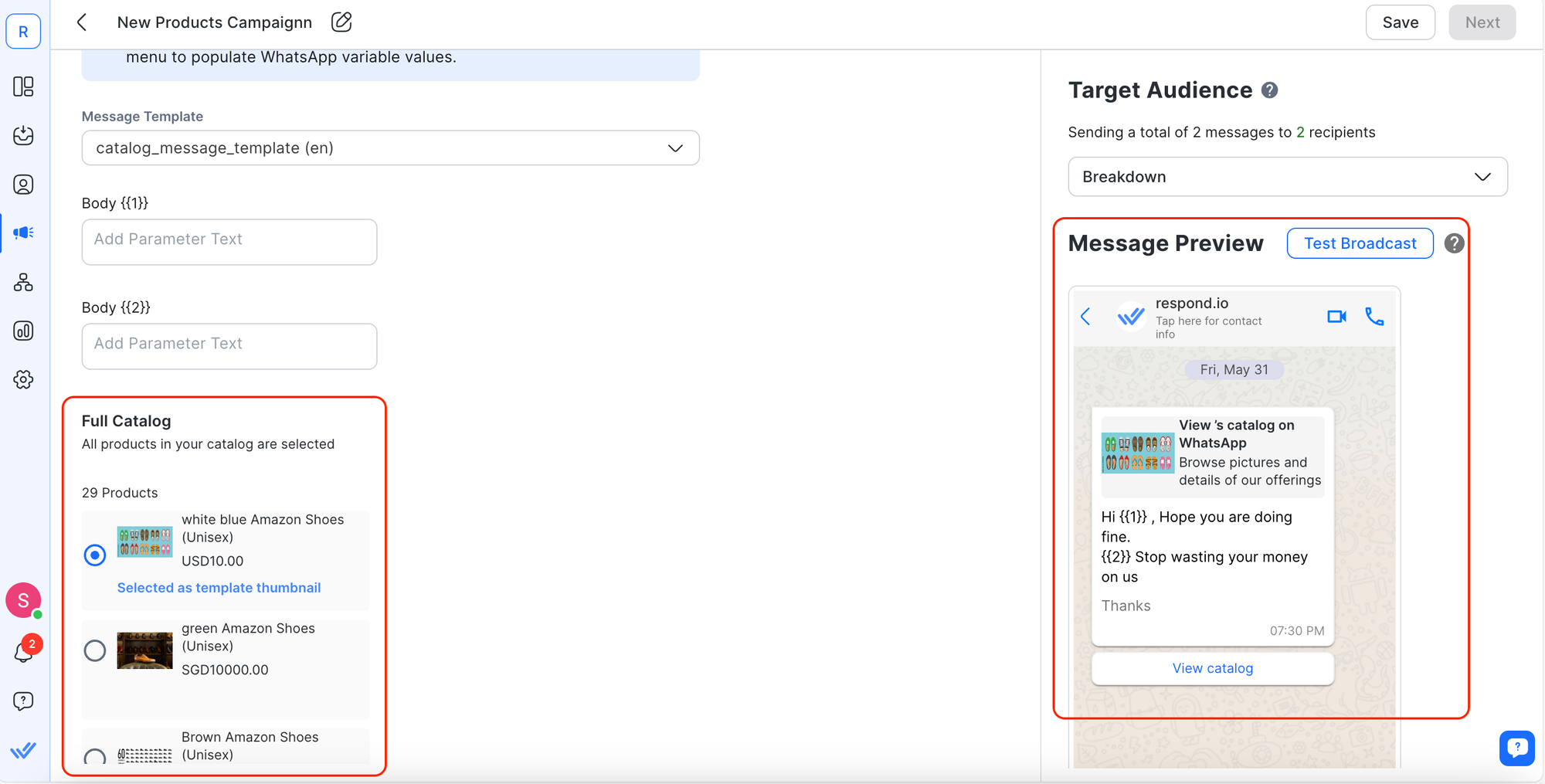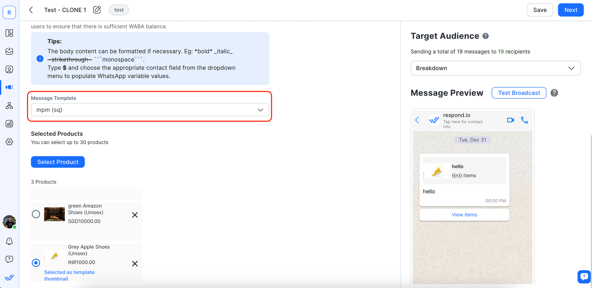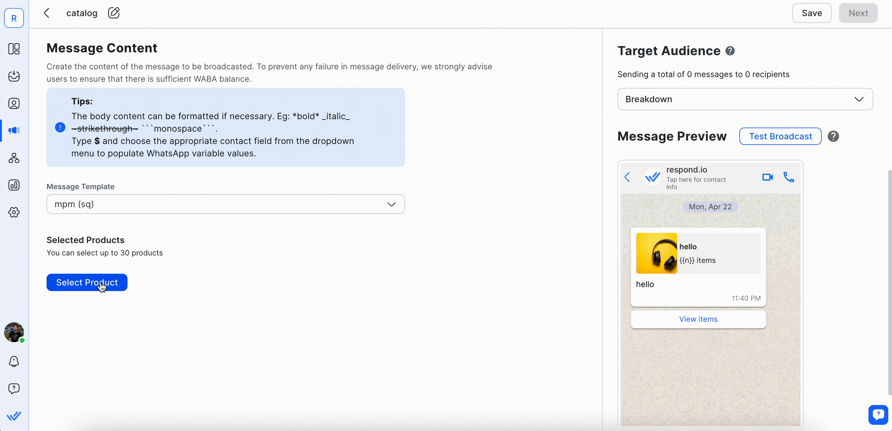 Langkah 2: Klik tombol Pilih Produk dan pilih hingga 30 produk untuk dikirim dalam siaran Anda dengan Templat Pesan Multi Produk.