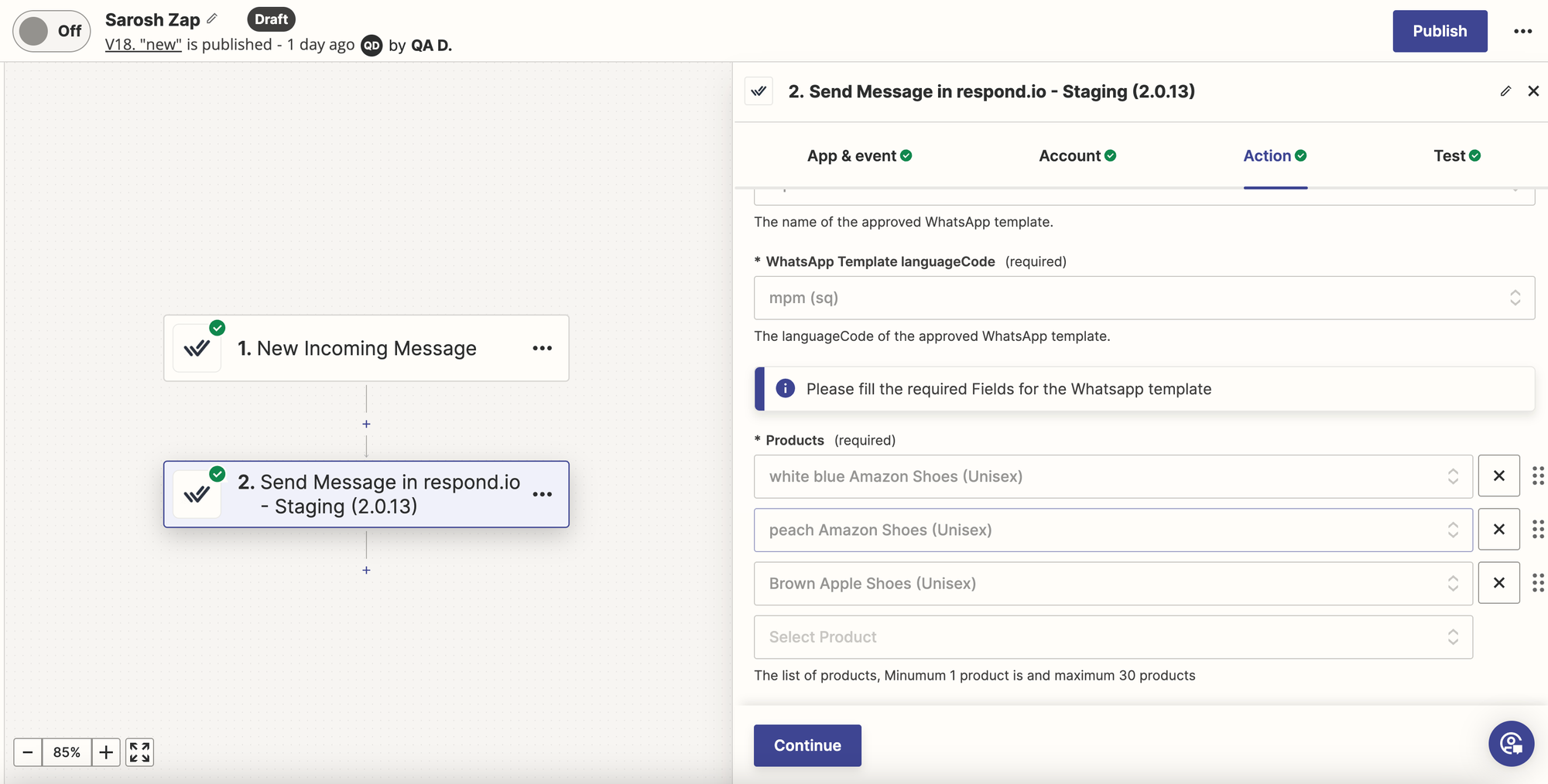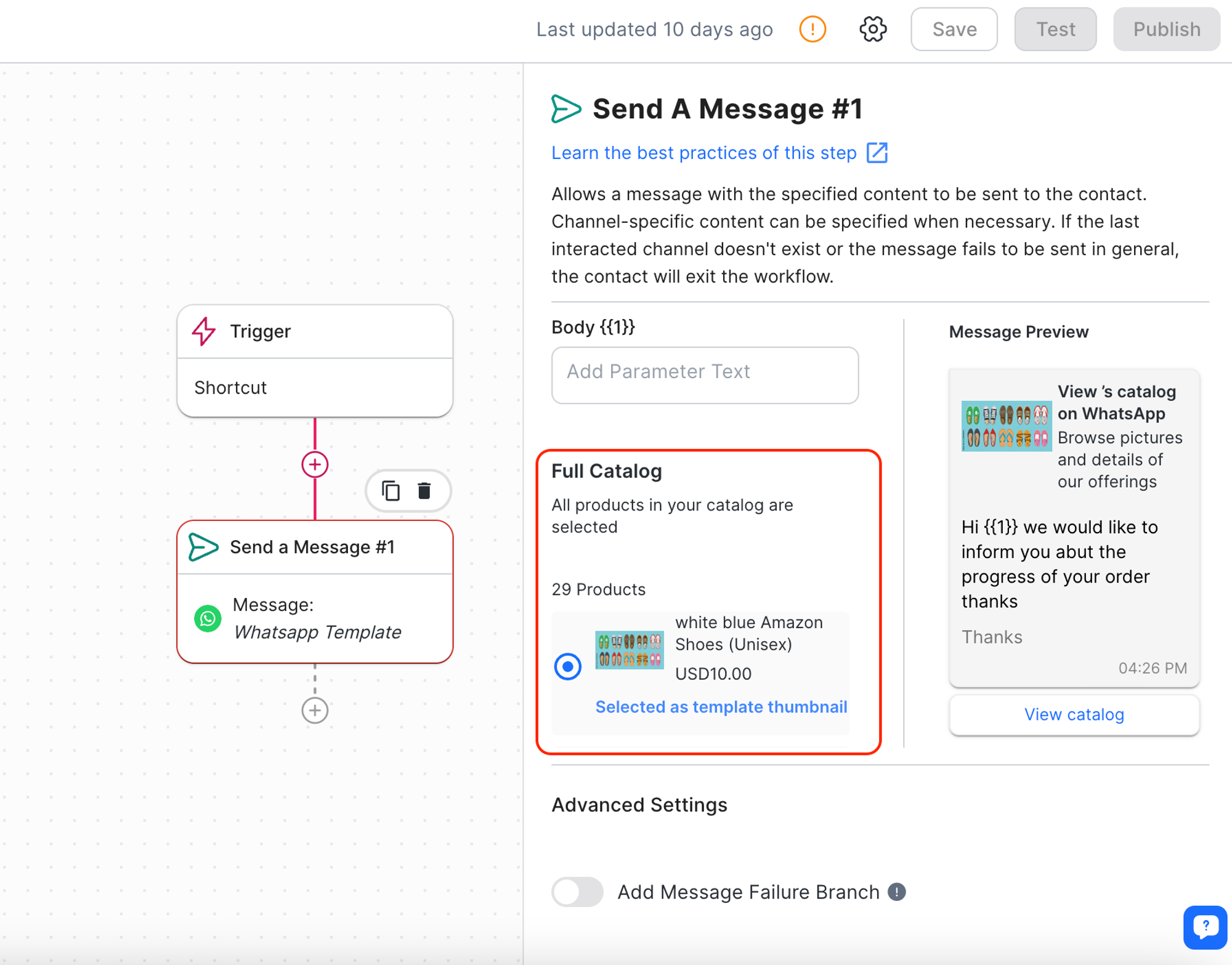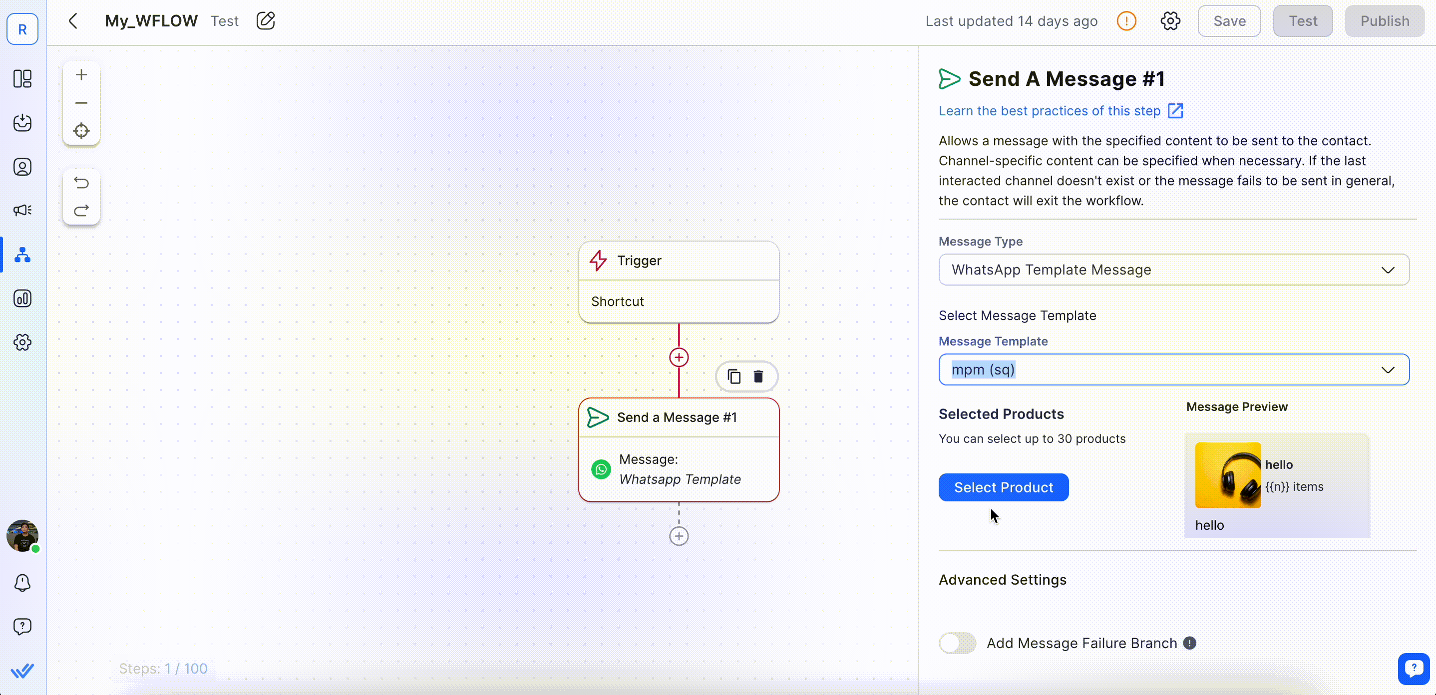 Anda dapat mengirim Pesan Template Produk di langkah “Kirim Pesan” di Modul Alur Kerja.
