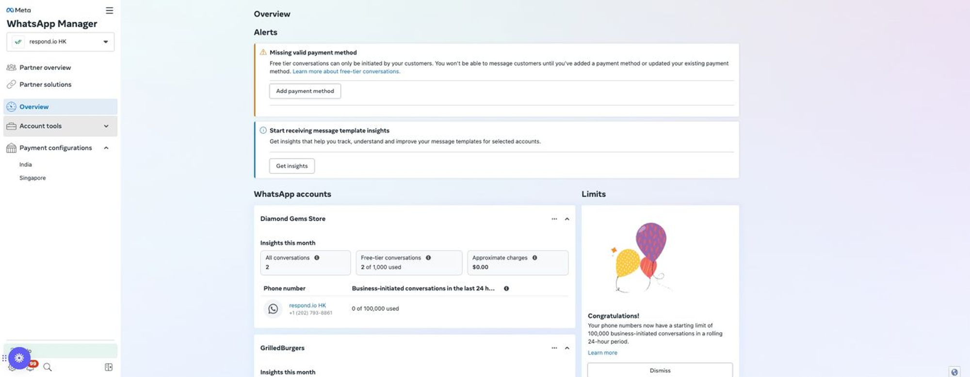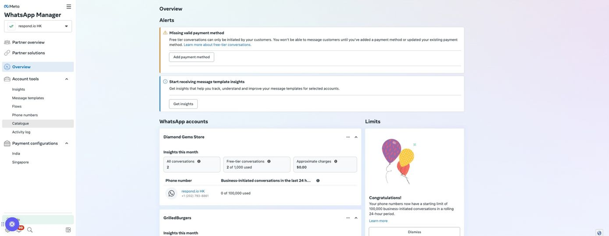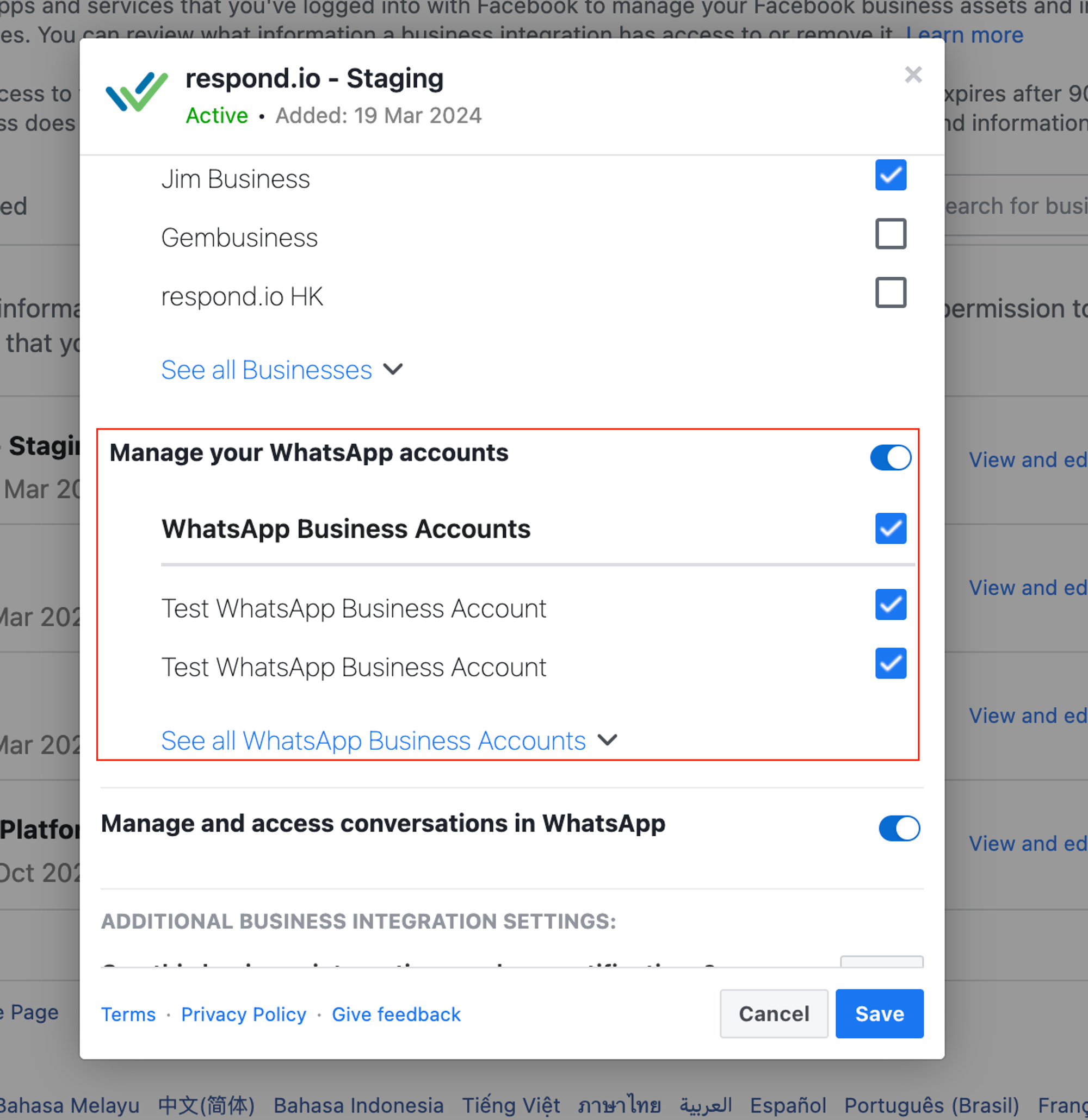 3. Pastikan Anda memiliki akses untuk mengelola WABA yang sama yang dipilih dalam daftar "Kelola akun WhatsApp Anda" . Jika tombol mati, aktifkan WABA yang dipilih.