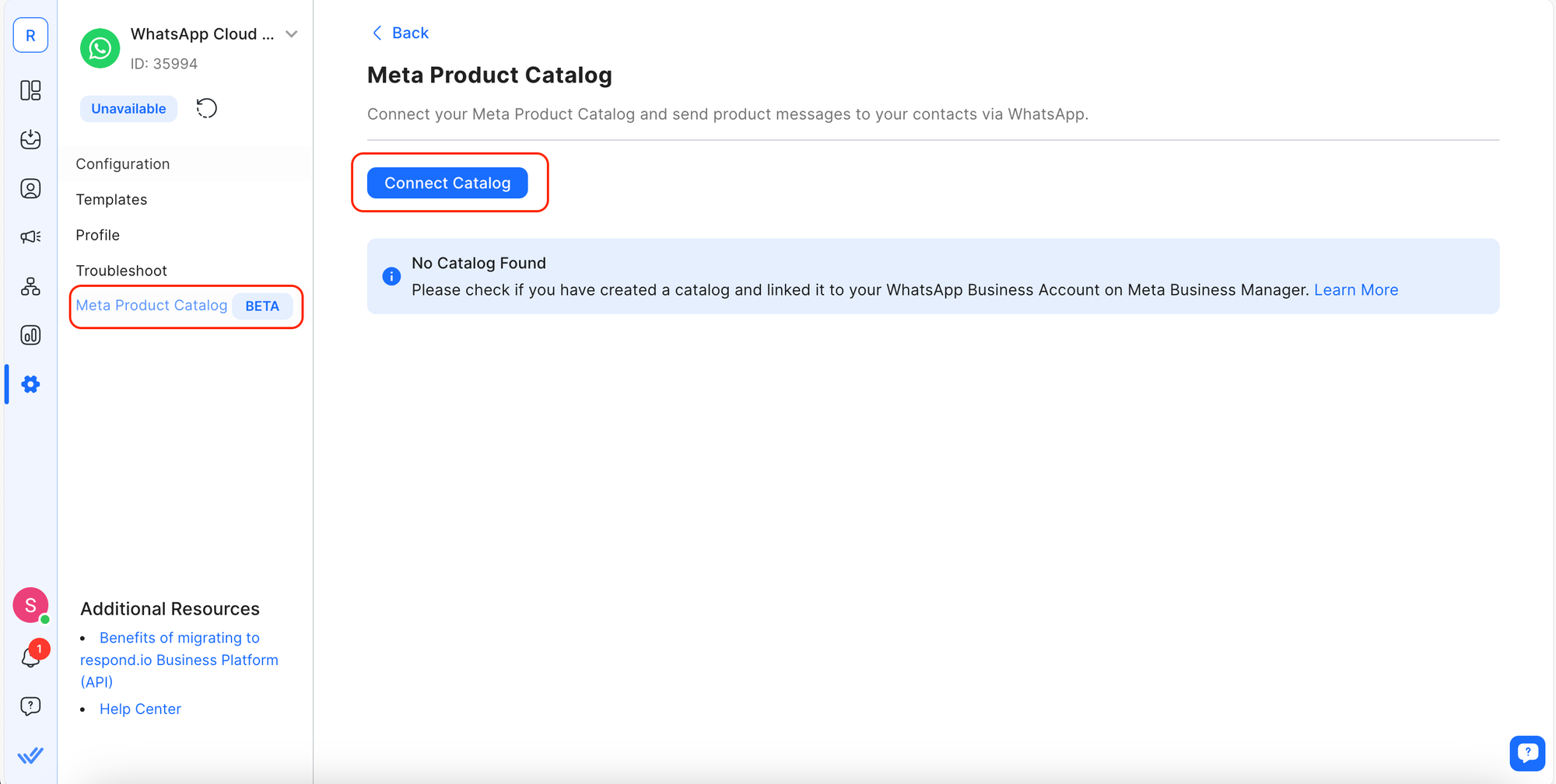 Jika token Anda telah kedaluwarsa, harap segarkan token katalog Anda di Saluran WhatsApp Business Anda di respond.io. Anda dapat melakukan ini dengan melepaskannya lalu menyambungkannya kembali.