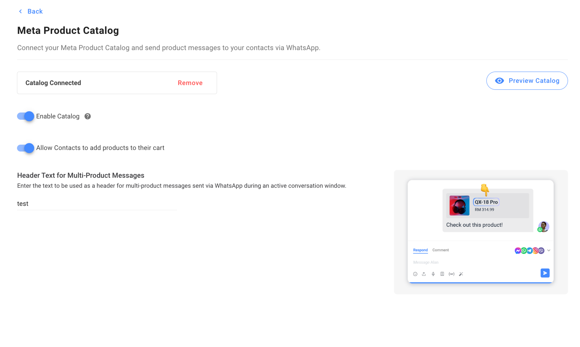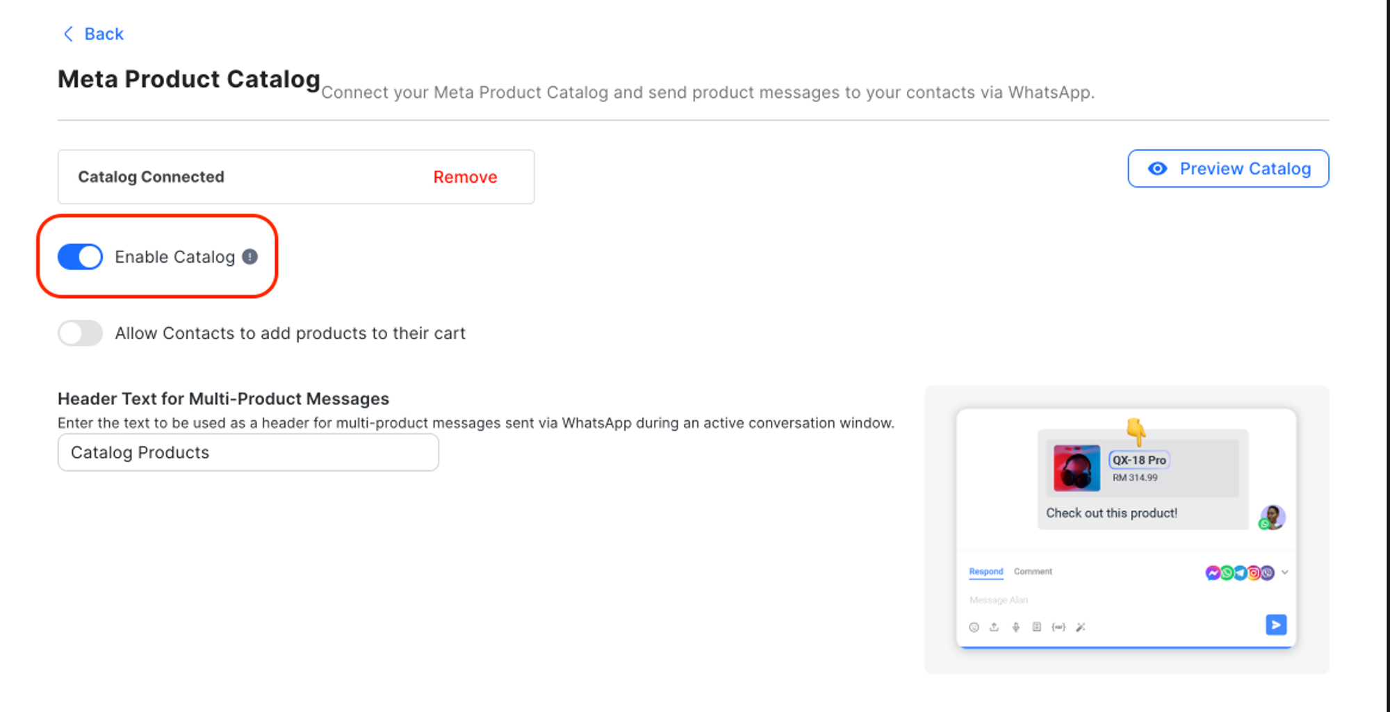 Aktifkan Katalog (alih): Bila diaktifkan, Anda dapat mengirim pesan produk untuk mengizinkan Kontak Anda mengakses katalog produk Anda.