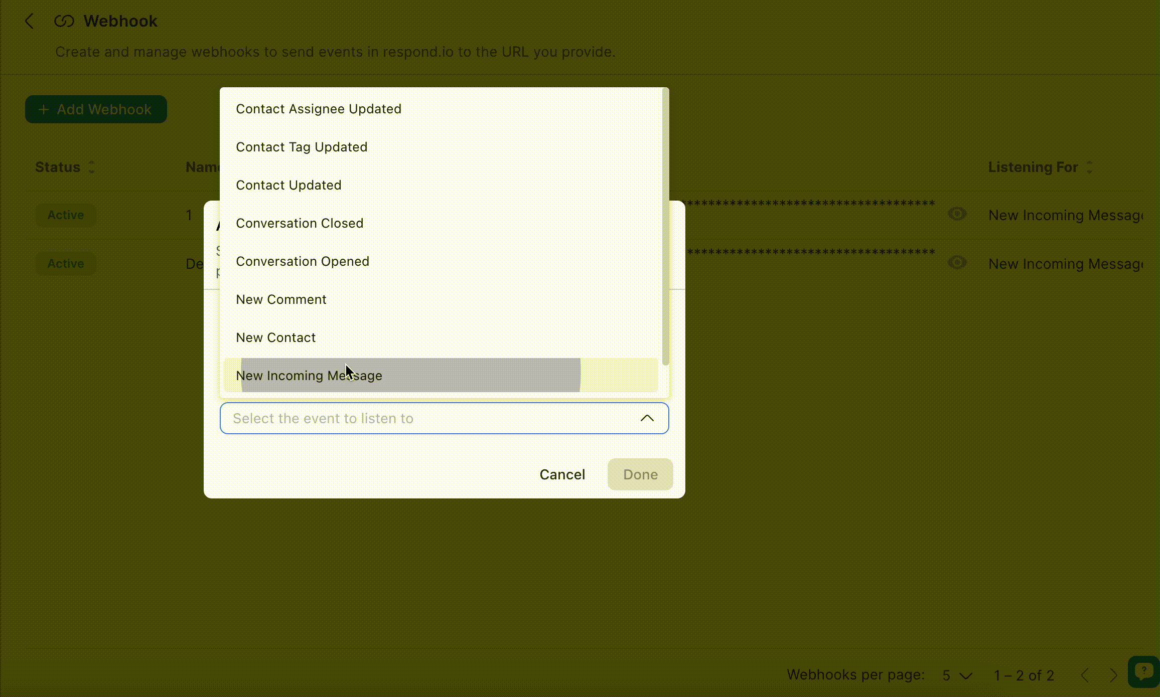 Langkah 2: Dalam daftar Peristiwa Webhook, pilih Pesan Masuk atau Keluar.
