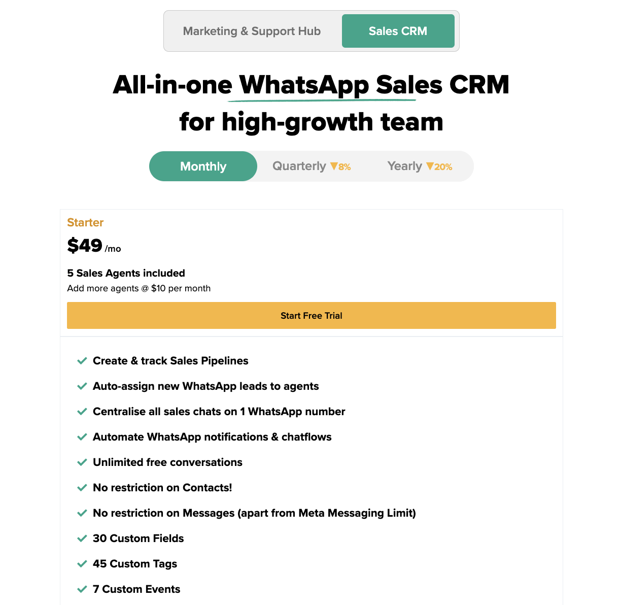 Starter | USD12 | Cassetta di posta condivisa (scegli tra WhatsApp o Instagram), conversazioni gratuite illimitate (entro i limiti Meta), invio di campagne in massa, pubblicità click to WhatsApp, notifiche e promemoria semplici |