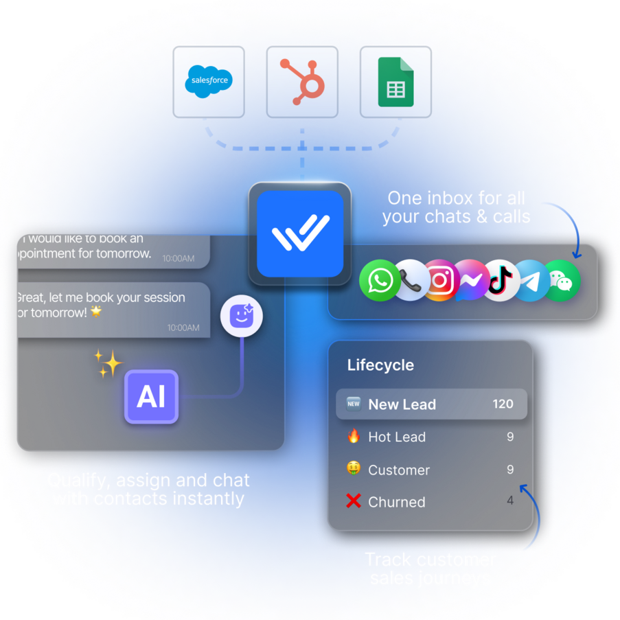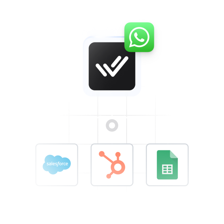 Sync contacts and conversations with Salesforce, HubSpot or Google Sheets in real time. You can also use Make.com or Zapier to connect with other CRM systems.