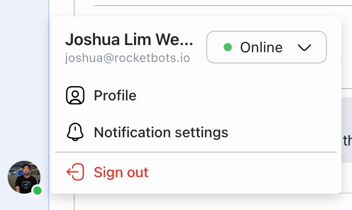 Seu status de atividade do usuário é visível para todos da sua equipe e aparece em toda a plataforma. Você pode vê-lo no canto inferior esquerdo, onde um indicador colorido é exibido ao lado de seu avatar.