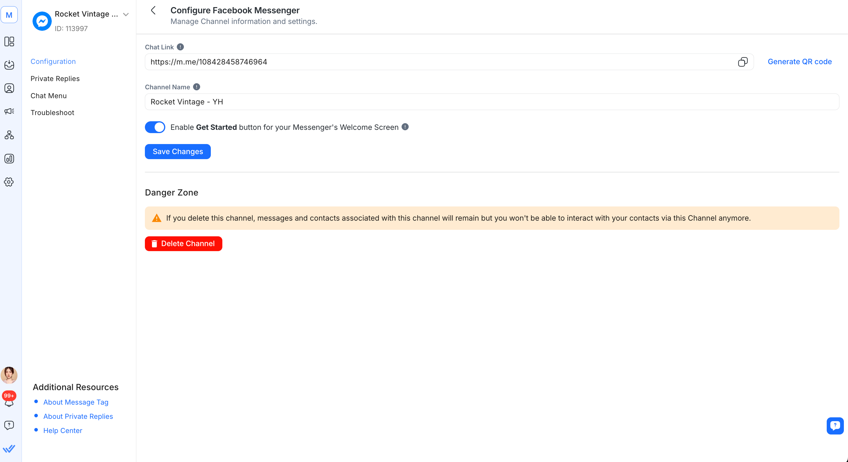 Страница конфигурации Facebook Messenger позволяет вам изменить название канала и предоставляет ссылку для перехода в чат.