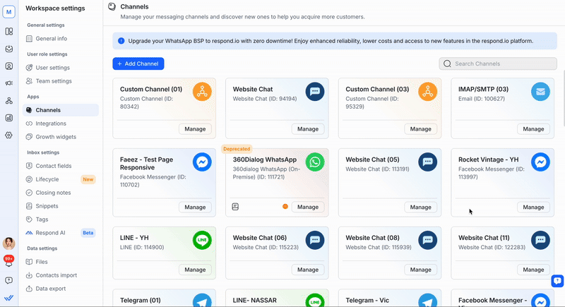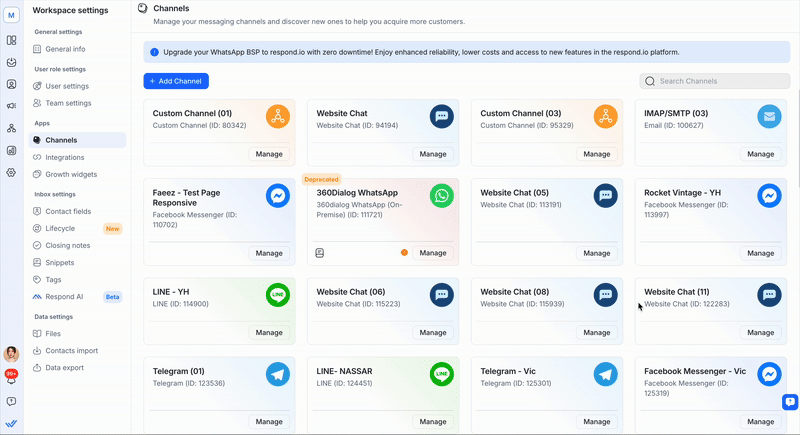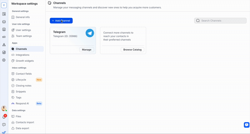 Шаг 4: На рабочей панели respond.io нажмите Settings>Channels