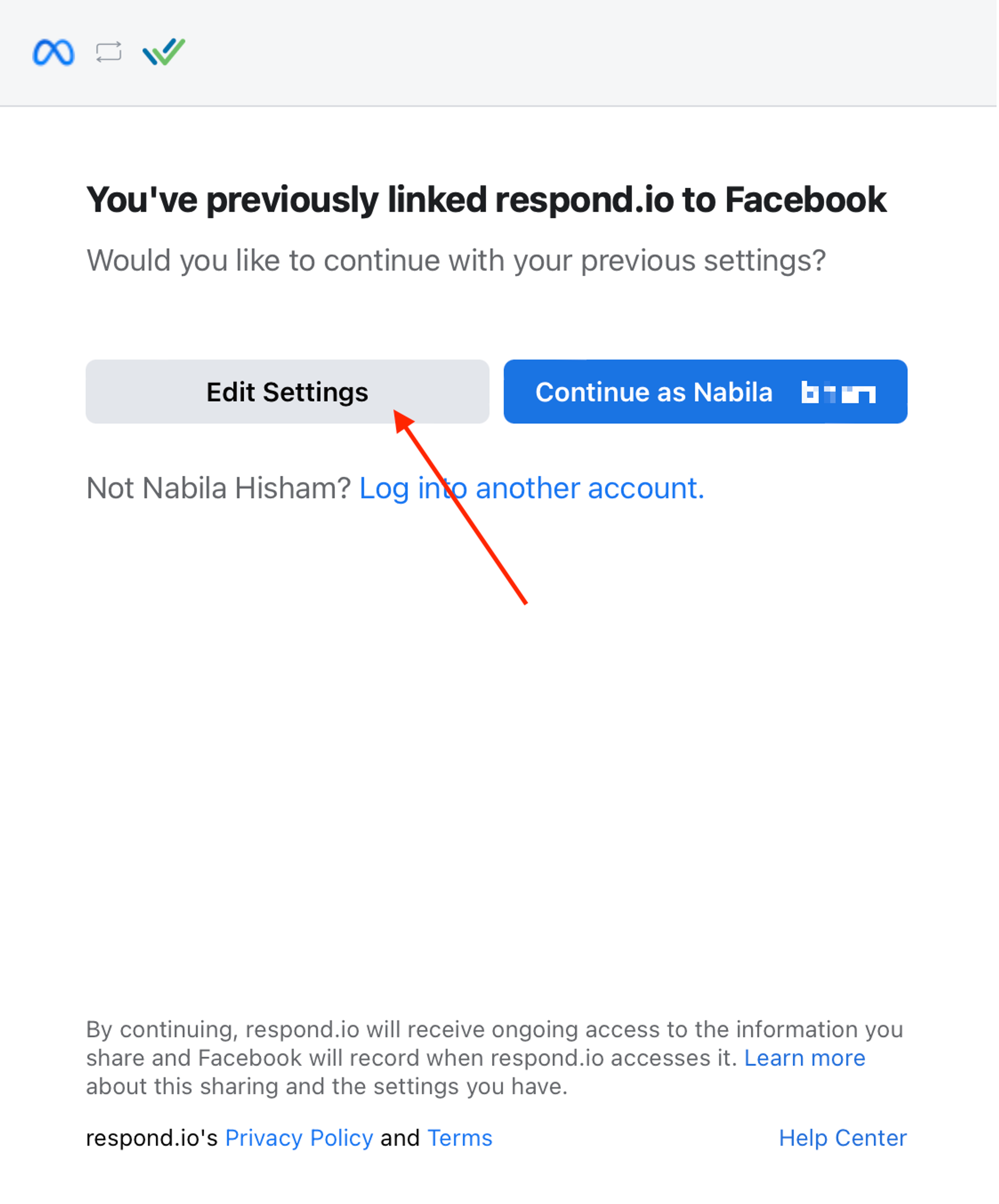 3. Подтвердите, что правильная страница Facebook выбрана в опции Изменить параметры на платформе respond.io.