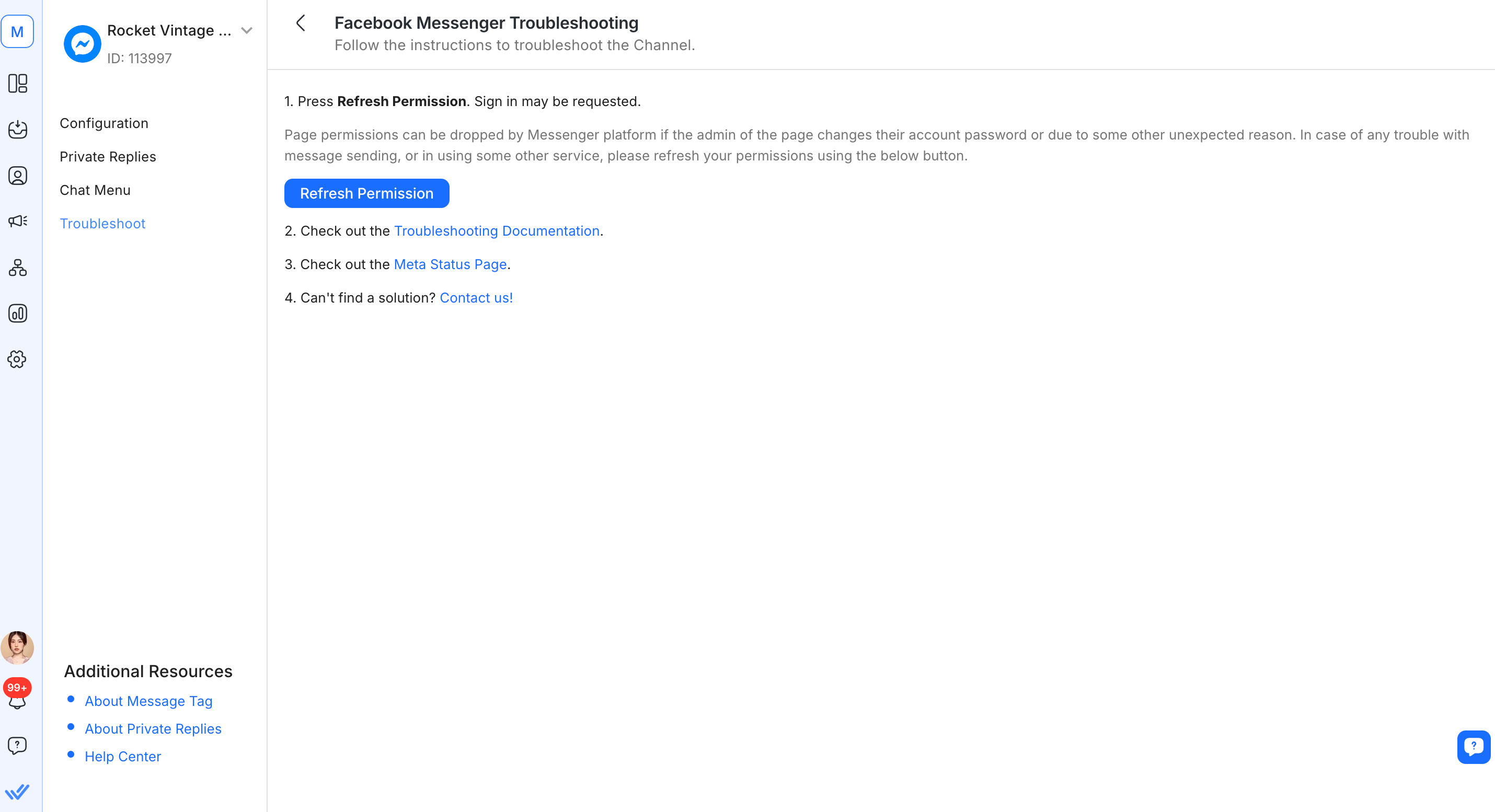 Шаг 1: Нажмите Настройки > Каналы > Facebook Messenger > Управление > Проблемы > Обновление разрешения