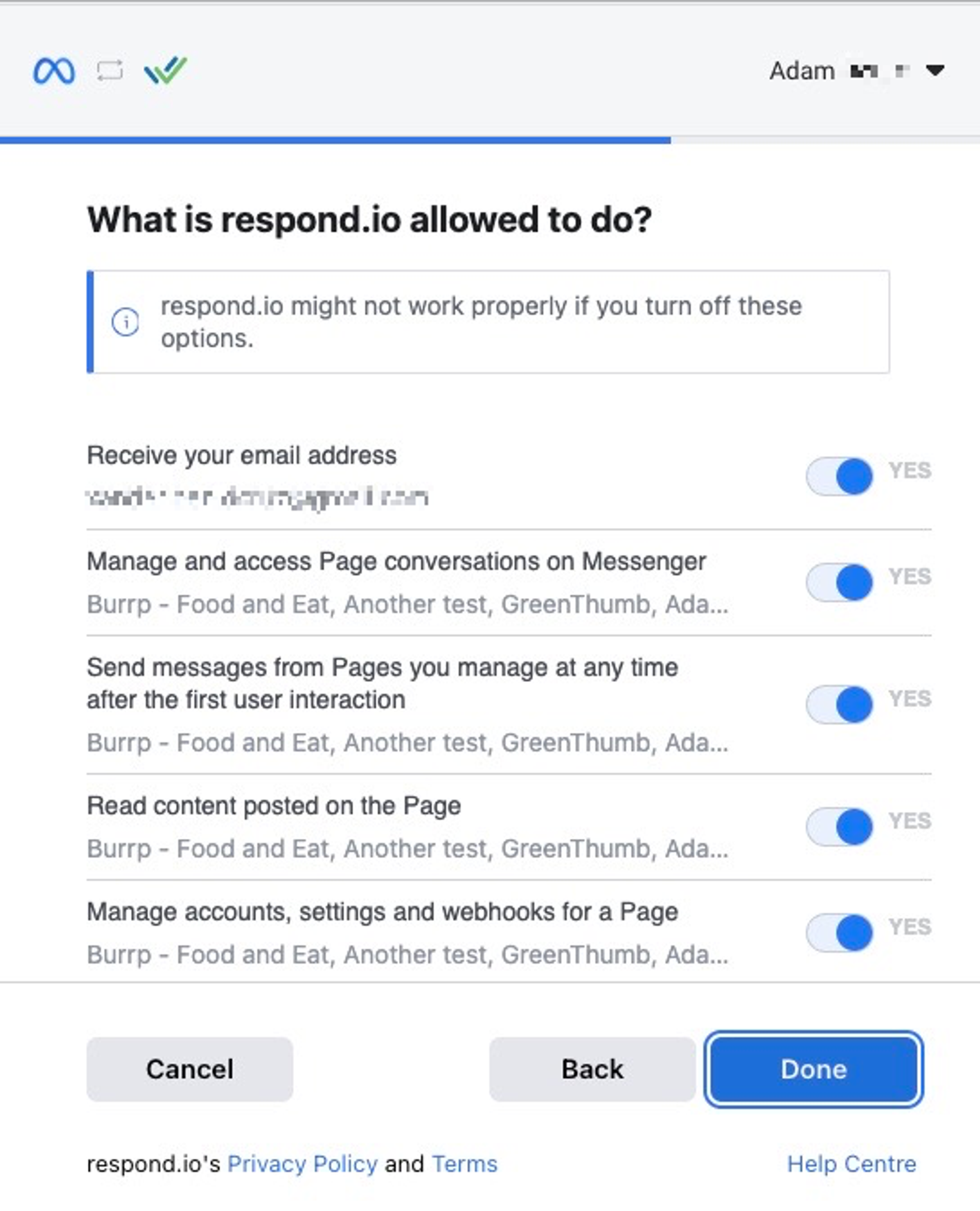 Почему я не могу подключить канал Facebook Messenger к respond.io?