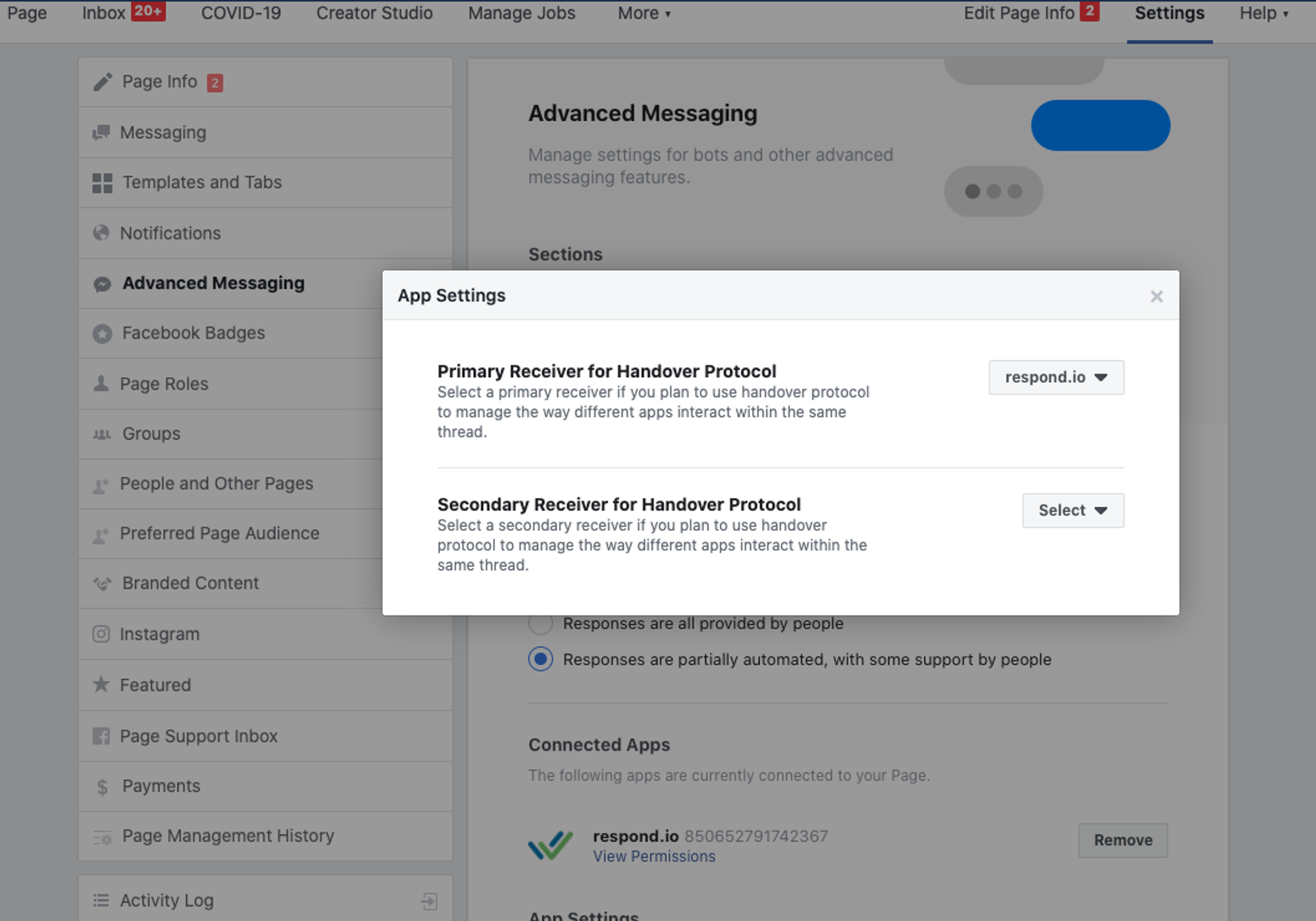 Перейдите на свою страницу в Facebook и нажмите Настройки > Расширенные сообщения > Подключенные приложения, затем нажмите Настроить.. В окне Настройки приложения установите respond.io как Основного получателя.