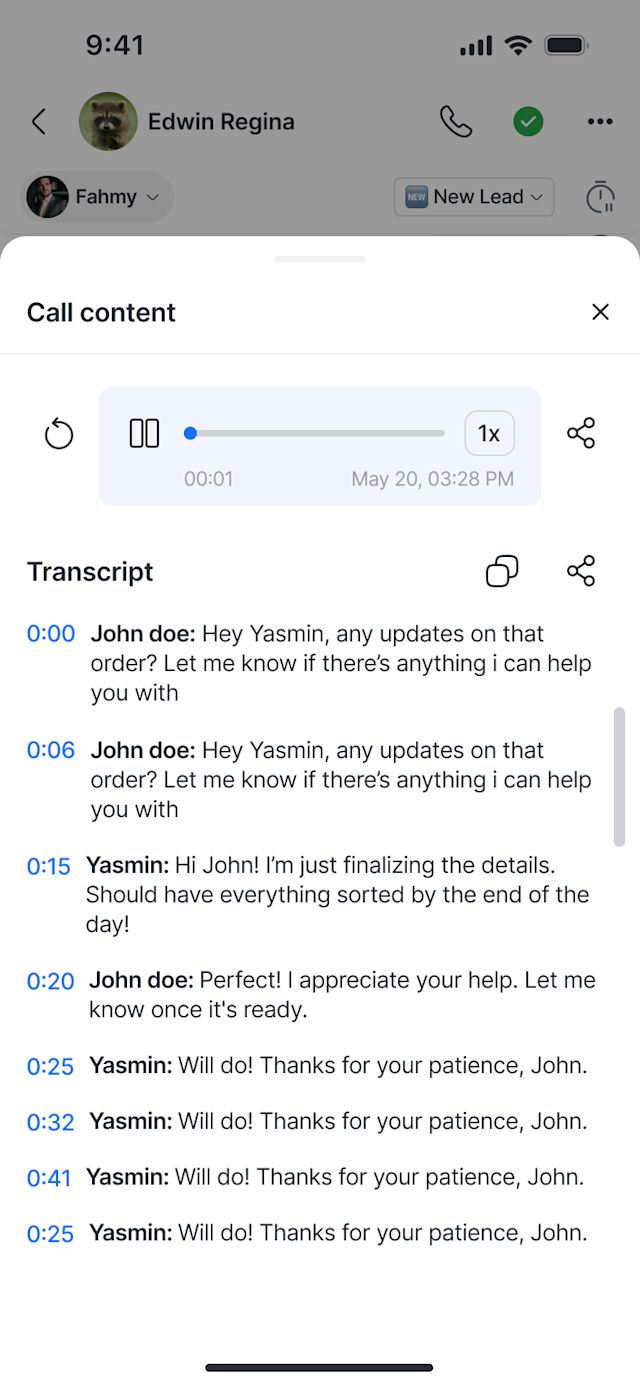 Вы можете просмотреть записи звонков прямо из события контакта. Каждая запись прикреплена к соответствующему событию, например: Фахми завершил исходящий VoIP-звонок. Длительность: 4:25 Просмотреть запись.