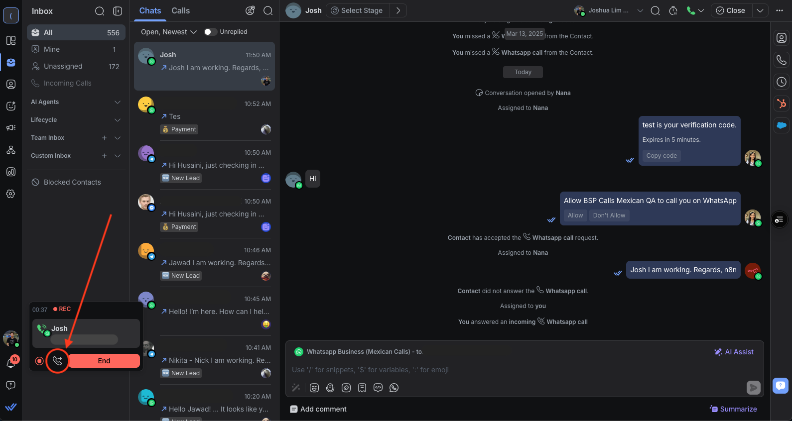 Голосовое взаимодействие: Используйте папку «Входящие» response.io, чтобы совершать и принимать звонки, используя ваш номер Telnyx.