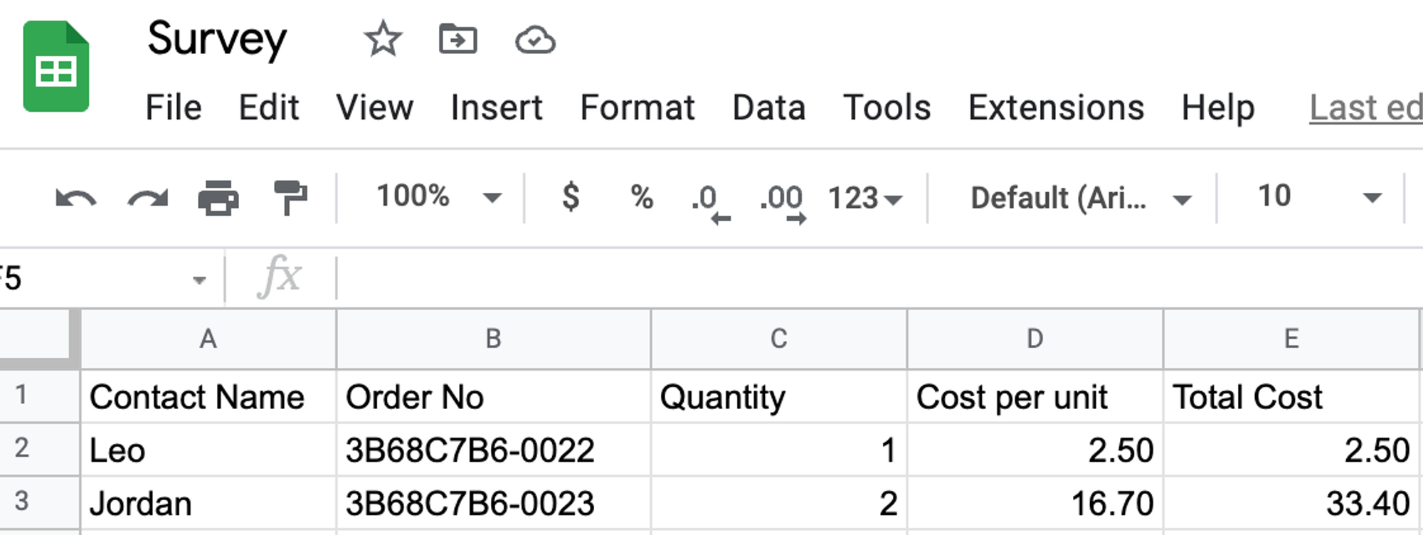 Когда рабочий процесс запускается, значения, указанные в поле сопоставления колонок, будут добавлены в таблицу Google Sheets, создавая новую строку внизу таблицы для отображения данных.