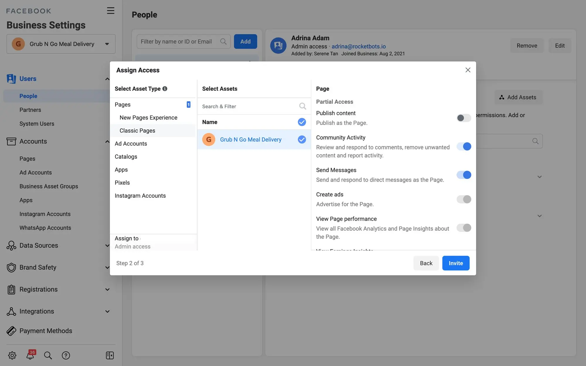 3. กำหนด ระดับการเข้าถึงของตัวแทน อย่าลืมเปิดการสลับส่งข้อความเพื่อให้ตัวแทนของคุณตอบกลับ DM ได้ในฐานะบัญชีธุรกิจ Instagram เมื่อเสร็จแล้ว คลิกเชิญเพื่อส่งคำเชิญไปยังตัวแทน