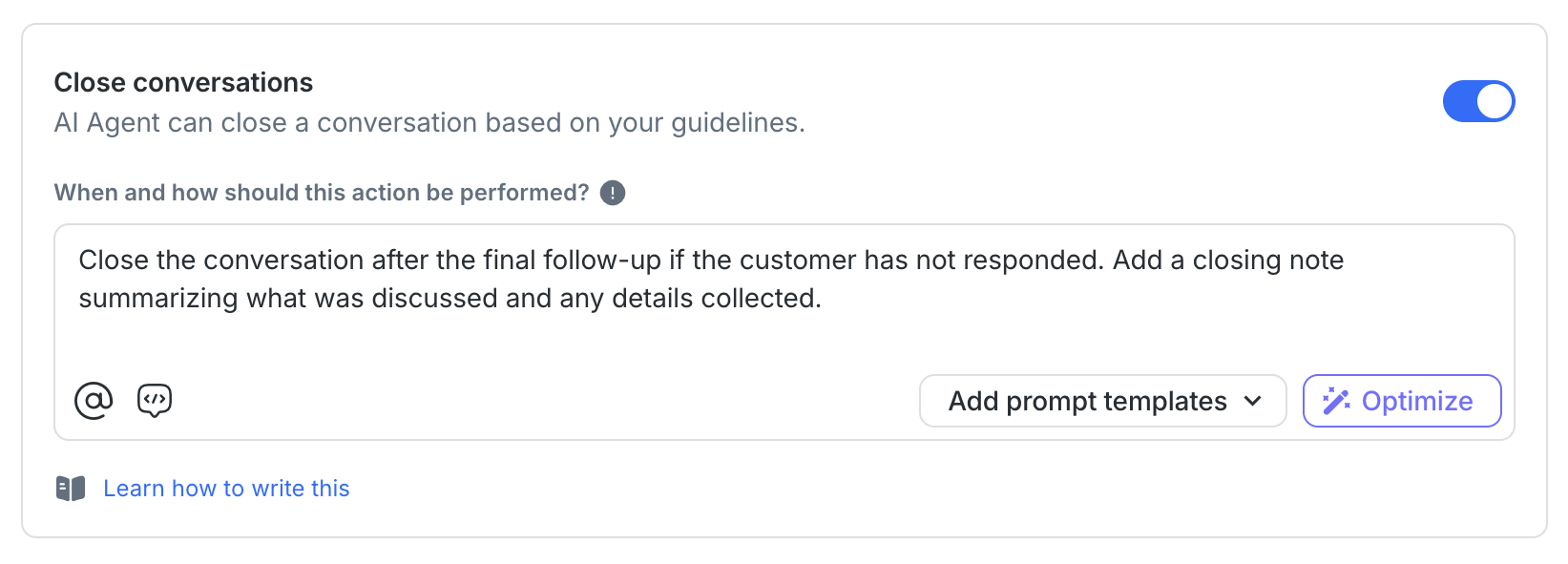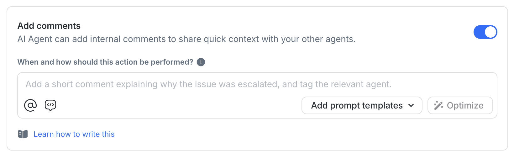 This action lets the AI Agent leave internal notes on a conversation, like summarising what was discussed before handing off to a human. Enable this action so the comment prompts in your Assign Conversation action work correctly. No additional prompt is needed here.