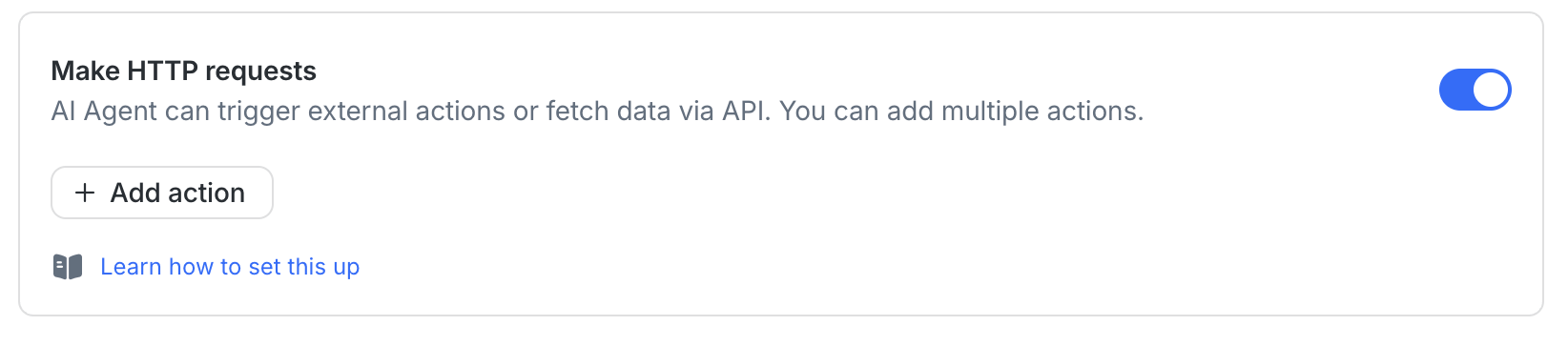 This is optional and intended for advanced users with an existing booking system API. Do not include HTTP Request instructions in the Instructions field, configure it only in the Actions tab. For setup details, see AI Agent Action: Make HTTP Requests.