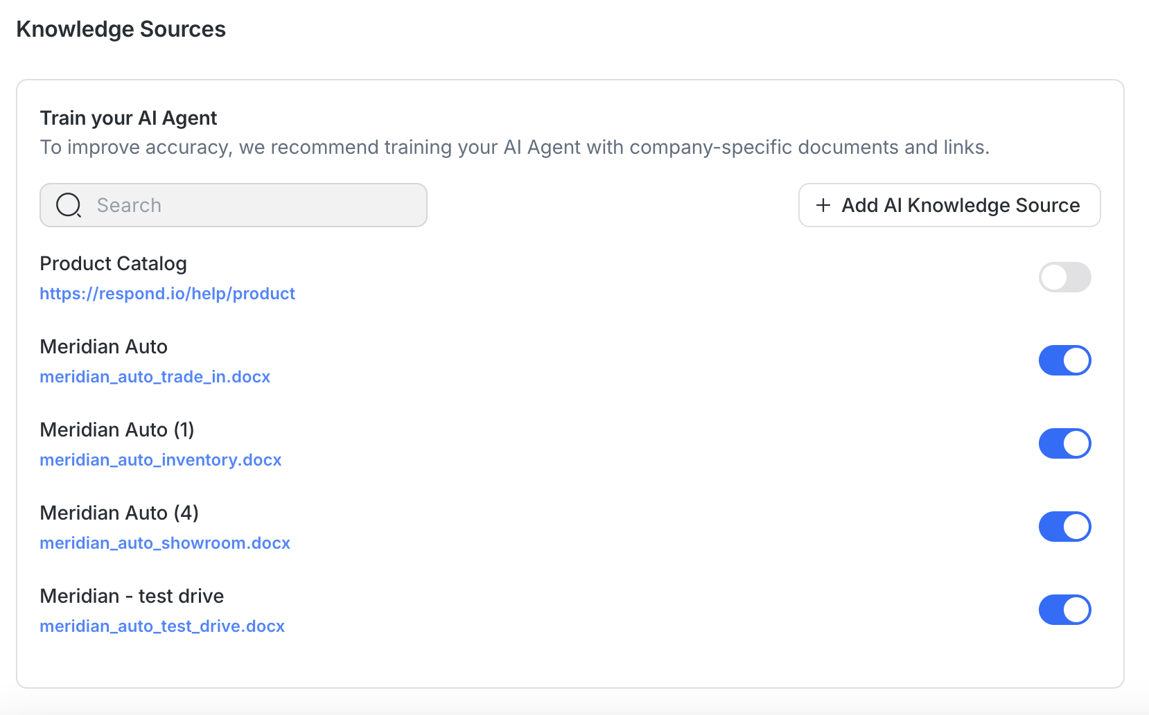 Knowledge Sources give your AI Agent access to your dealership's specific information, like your vehicle inventory, pricing, promotions, and policies. For a real business use case like automotive sales, adding Knowledge Sources is essential. Without them, your AI Agent won't be able to answer customer questions about your models, pricing, and services accurately.