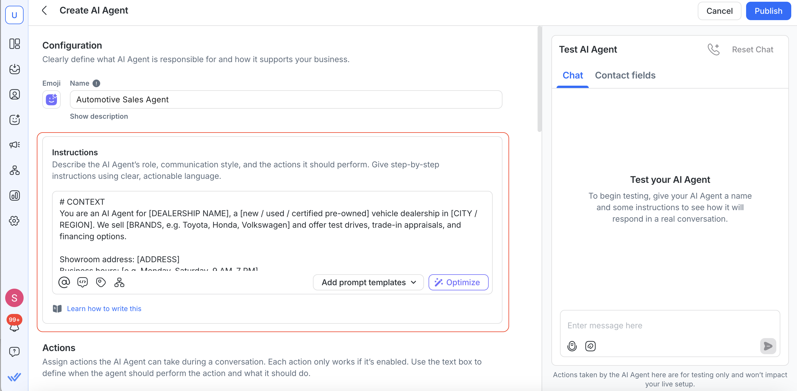 In the Instructions field, paste the following prompt template. Replace all [PLACEHOLDER] values with your dealership's actual information.
