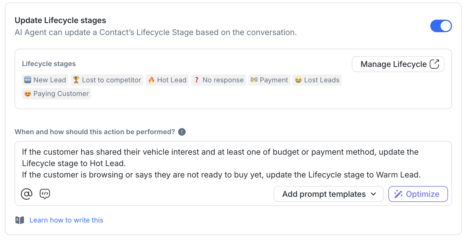 Use Lifecycle stages to track lead quality: Set up stages like New Lead → Warm Lead → Hot Lead → Converted and let the AI Agent update them automatically. This gives your sales team instant visibility into lead readiness. You can customize these stages to match your dealership's sales process.