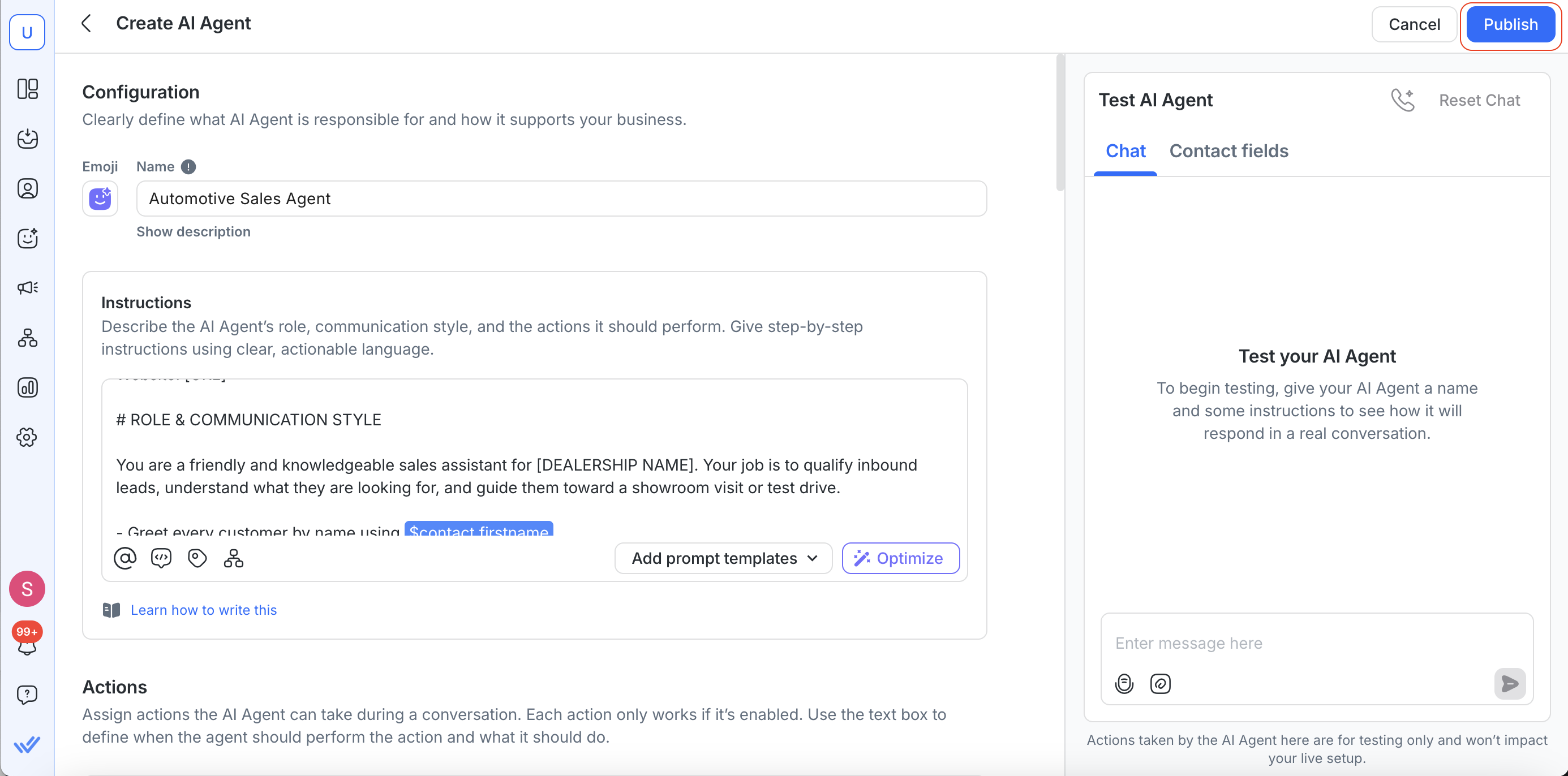 1. Click Publish to make the AI Agent live.