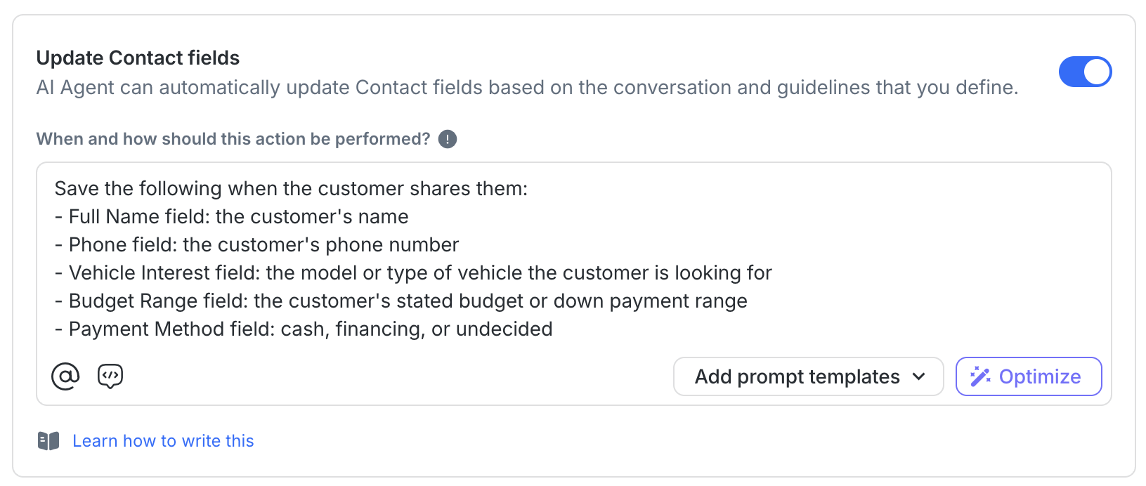 • The custom fields (e.g. "Vehicle Interest", "Budget Range") have been created in Workspace Settings > Contact Fields.
