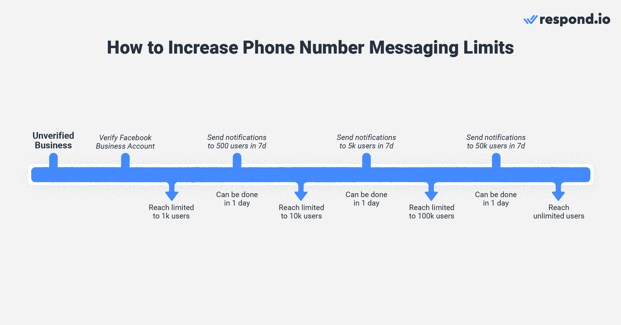 只要您的電話號碼狀態為已連線且品質評級不低/被標記,這些步驟將引導您在大約 4 天內將訊息限制從 1k 增加到無限。