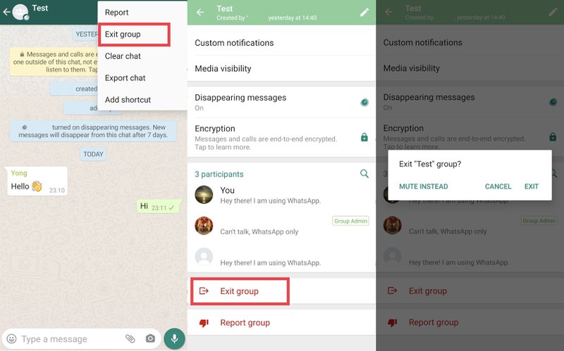Nếu bạn có một nhóm WhatsApp đang quá tải, bạn có thể rời khỏi nhóm. Chỉ cần nhấn vào ba dấu chấm ở góc trên bên phải > Thêm > Thoát khỏi nhóm. Ngoài ra, hãy chạm vào Tên nhóm WhatsApp. Sau đó nhấp vào Thoát nhóm > Thoát.