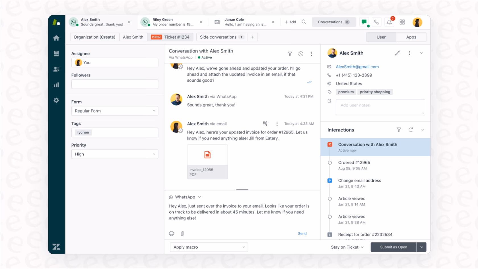 优秀的全渠道 CRM 将所有客户对话汇入一个统一收件箱——包括 WhatsApp、Instagram、TikTok、Telegram、电子邮件、SMS 甚至语音通话。 最重要的是,你选择的平台应允许你 将来自多个渠道的联系人对话合并 为单一客户故事,使坐席获得完整、不碎片化的上下文,客户无需重复说明。