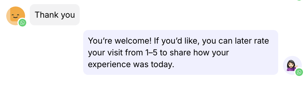 WhatsApp 的即时性与对话特性使得提供者能在服务交付后立即获取高质量反馈,从而最大化响应率与数据准确性。 调查有多种形式;最简单的是在就诊后进行 1–5 分的评分。