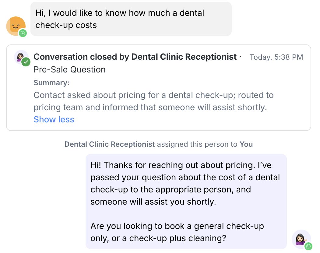 如果您在寻找满足这些要求并为医疗团队打造的平台,respond.io 是强有力的选择。 它支持官方 WhatsApp API,提供强大的自动化功能,并包含可针对您批准内容训练的 AI 代理。 行政人员、护士与医生也可共享同一收件箱、分配案件、留下注释,并跨渠道跟踪对话。 Respond.io 可与 CRM、预订工具和医疗系统集成,有助于减少人工工作并加快响应时间。