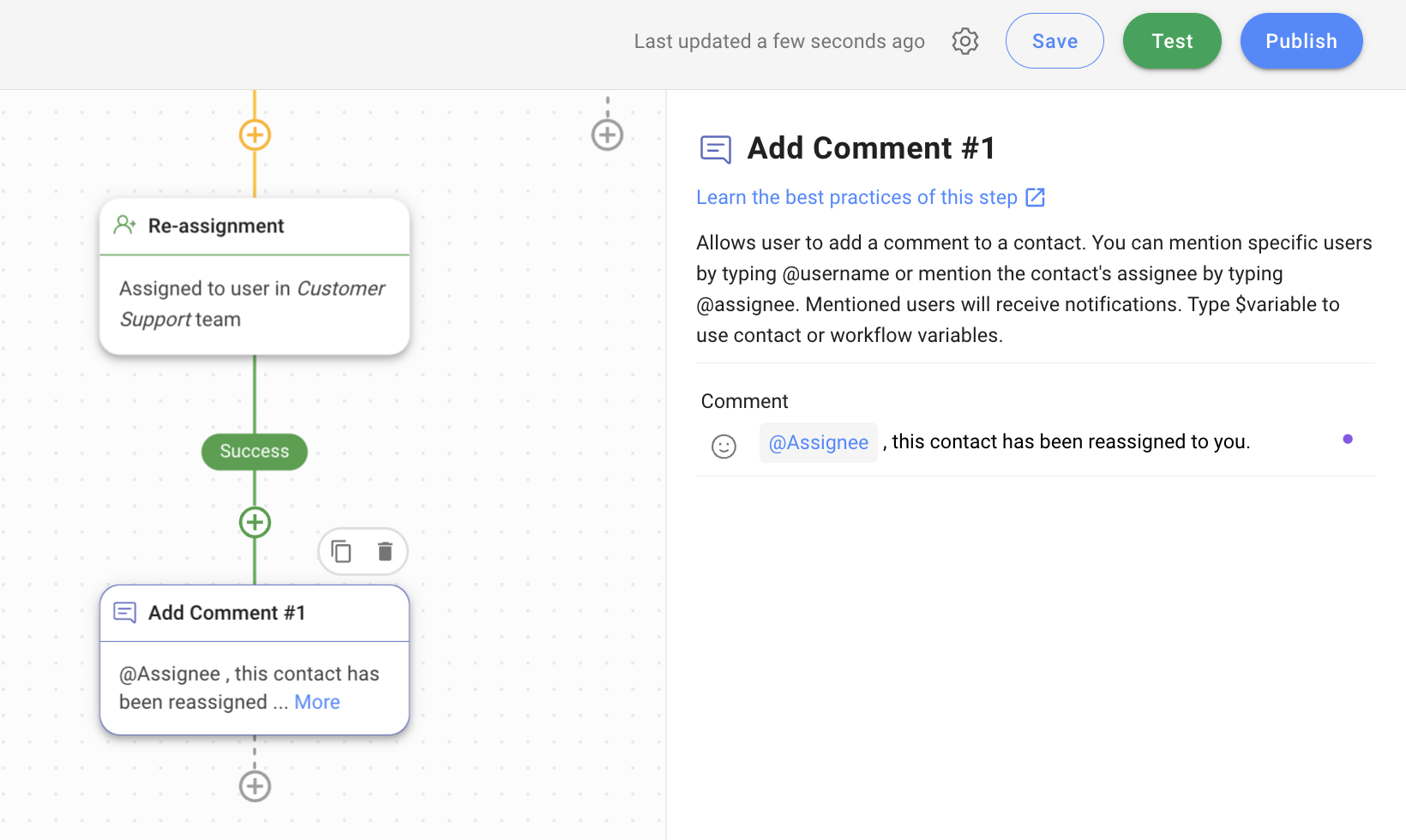 6. 可选地,您可以添加一个添加评论步骤,以写下有关联系人以便内部参考或行动的备注。 在此示例中,将会向第二个代理发送评论,以通知其重新指派联系人。